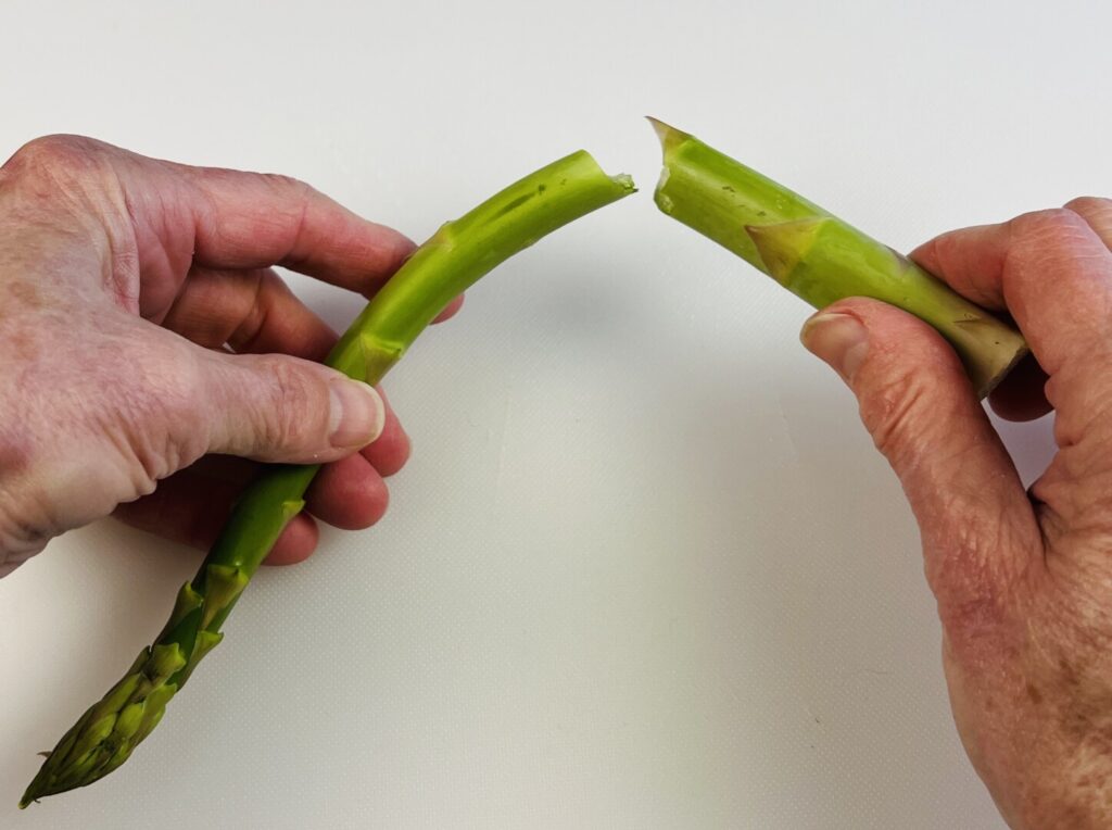- Snap each asparagus spear by holding the tip end with one hand and the butt end in the other, and then bending the spear until it breaks. Discard the tough butt ends.