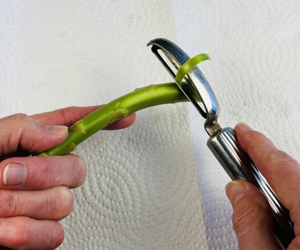 - Use a swivel peeler to gently scrape off the outer layer of skin from the lower half of each asparagus spear.