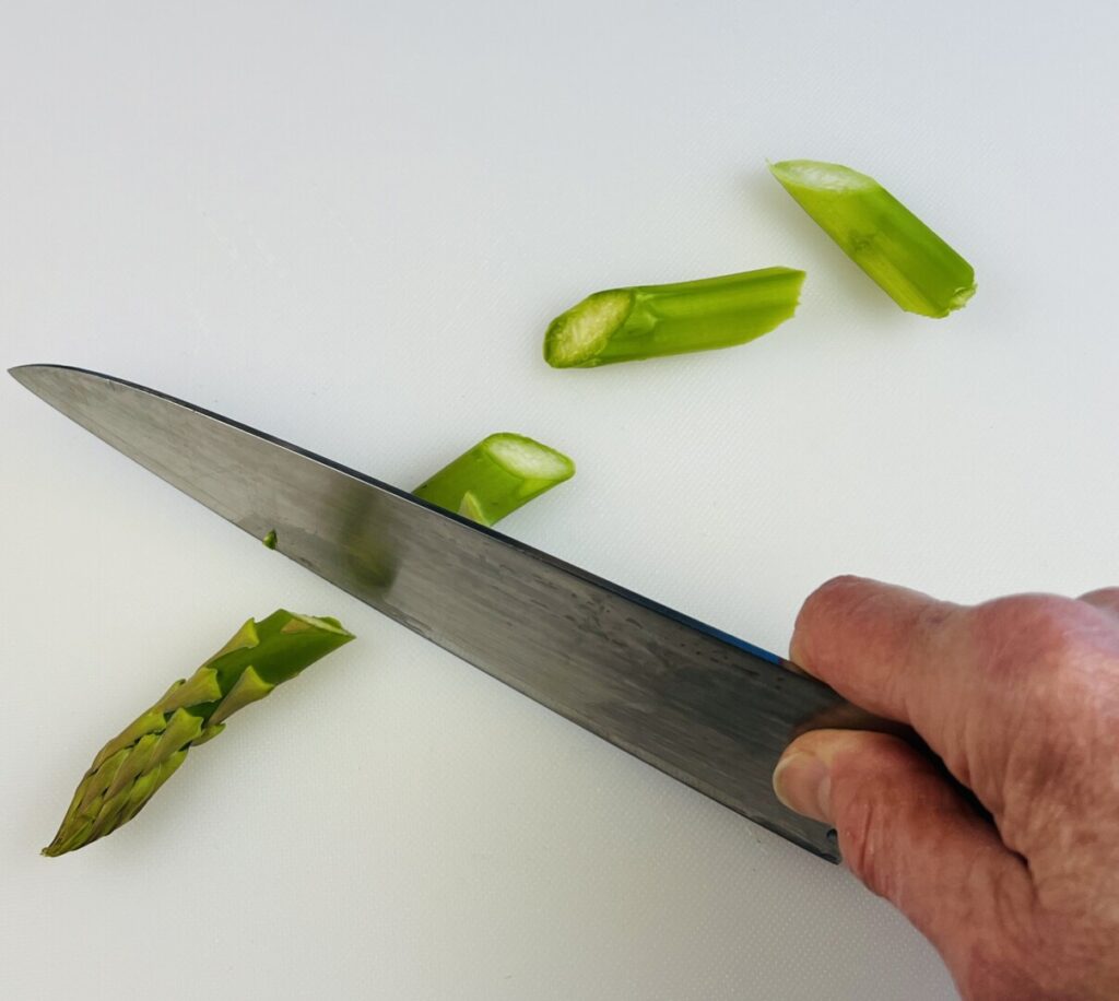 - Cut the asparagus spears on the diagonal into 1-inch lengths.