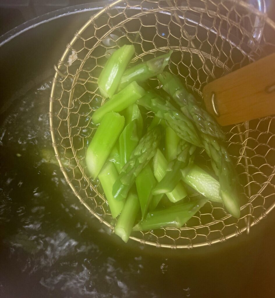 - Blanch and refresh the asparagus in the same way and drain on separate paper towels.