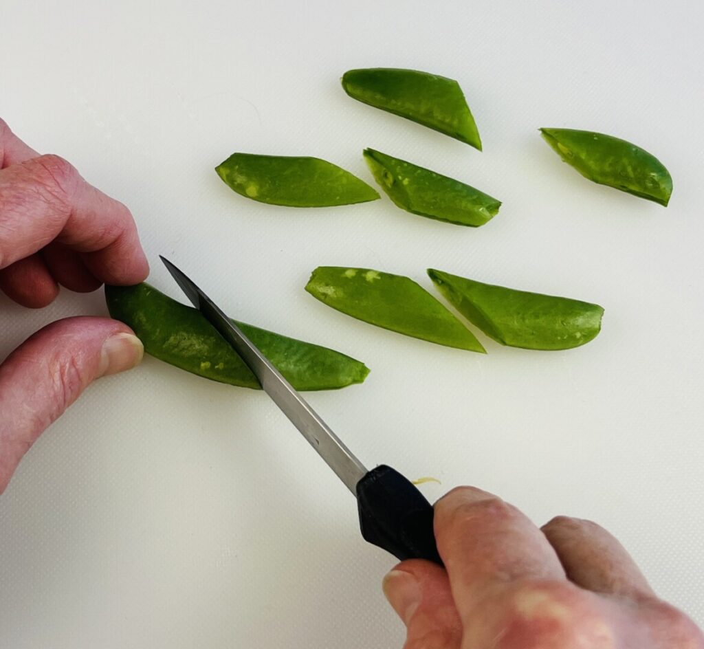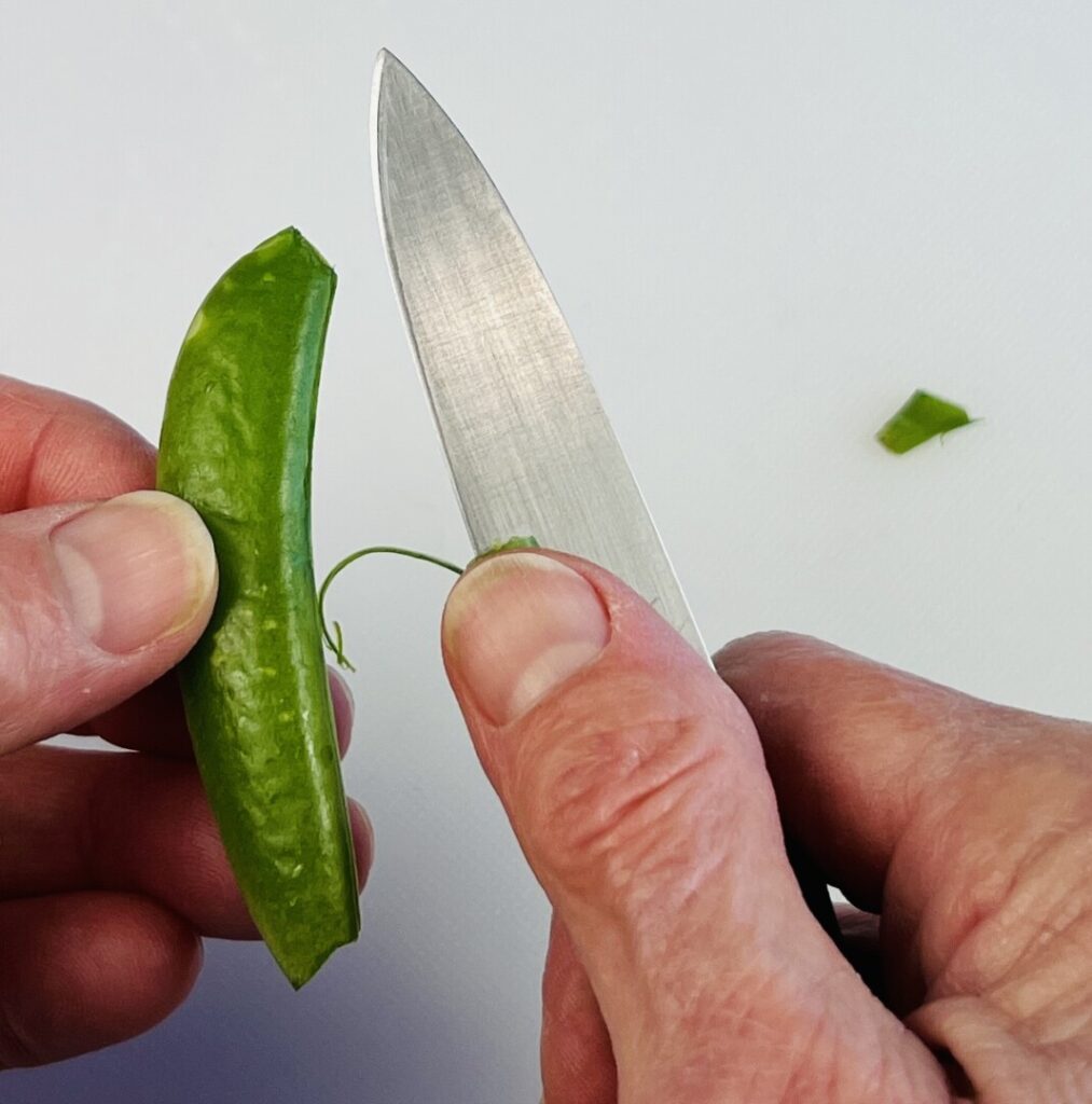 To partly fabricate the snap peas, trim off the stem ends and, while doing so, check for stings and remove them if necessary. Use a sharp paring knife to cut off the stem end and then pull downward. If there’s a string, grasp it between your thumb and the knife blade and continue pulling until the string separates from the pod. Do this on the other side of the pod as well. Some snap pea cultivars have prominent, fibrous strings and others don’t. For best texture and pleasant mouthfeel, check every snap pea.