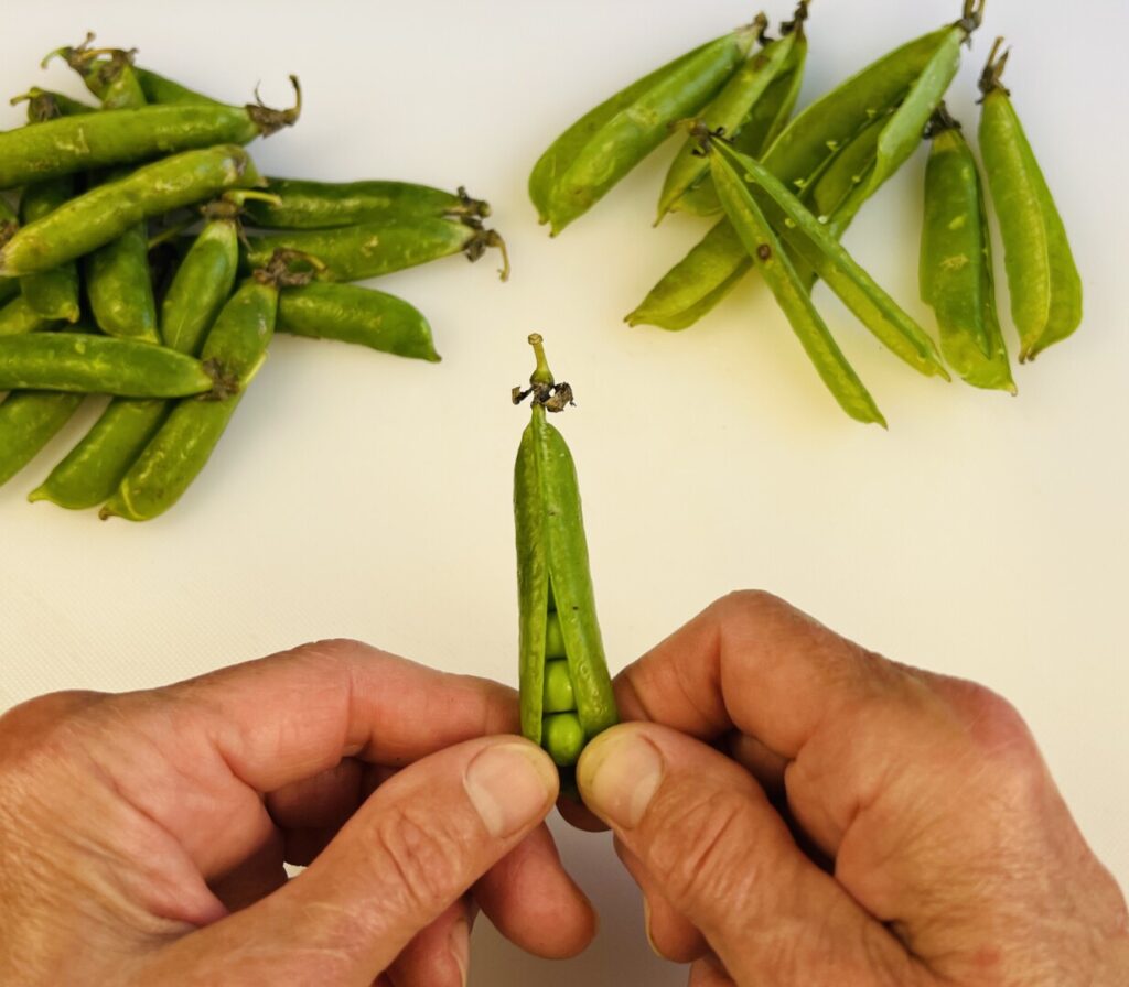 Snap peas (sometimes marketed as “sugar” snap peas) are one of several types of edible-pod peas. Flat, crunchy snow peas were developed in Europe in the 16th century and, in French, were called mange-touts, or “eat-alls.” Trade routes introduced them to China, where they were extensively cultivated and improved. Tender, plump-podded snap peas were developed in the US in the 1970s, and have become widely popular. Early cultivars had strings on each side of the pod; later, stringless varieties were developed. Today, some varieties you buy have strings, whereas others don’t. To ensure a pleasant texture, always attempt to string your snap peas as shown subsequently in this lesson post.