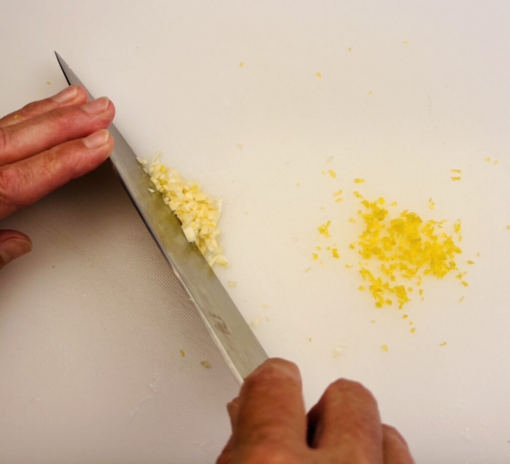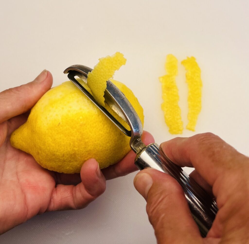 - Use a swivel peeler to shave off two strips of yellow zest from the lemon. Mince the lemon zest and place it in a small container. Squeeze about 1 tsp lemon juice into the container with the zest.