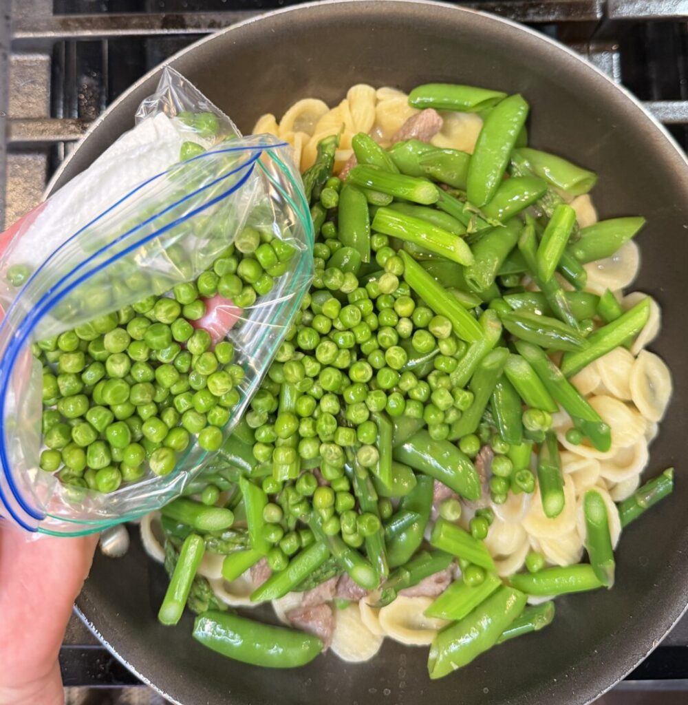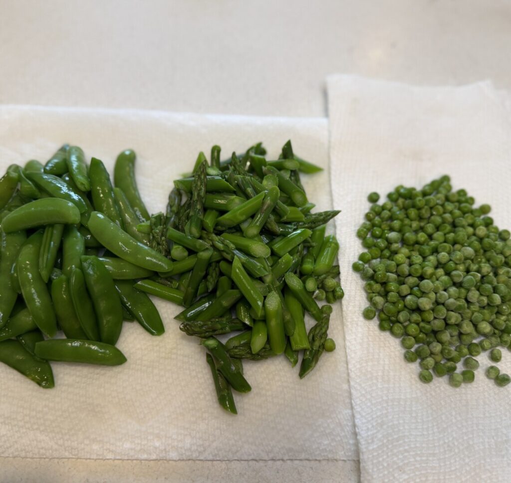 - If prepping ahead, combine the snap peas and asparagus in a plastic bag with a folded paper towel in the bottom. Place the thawed or cooked peas in a similar bag.