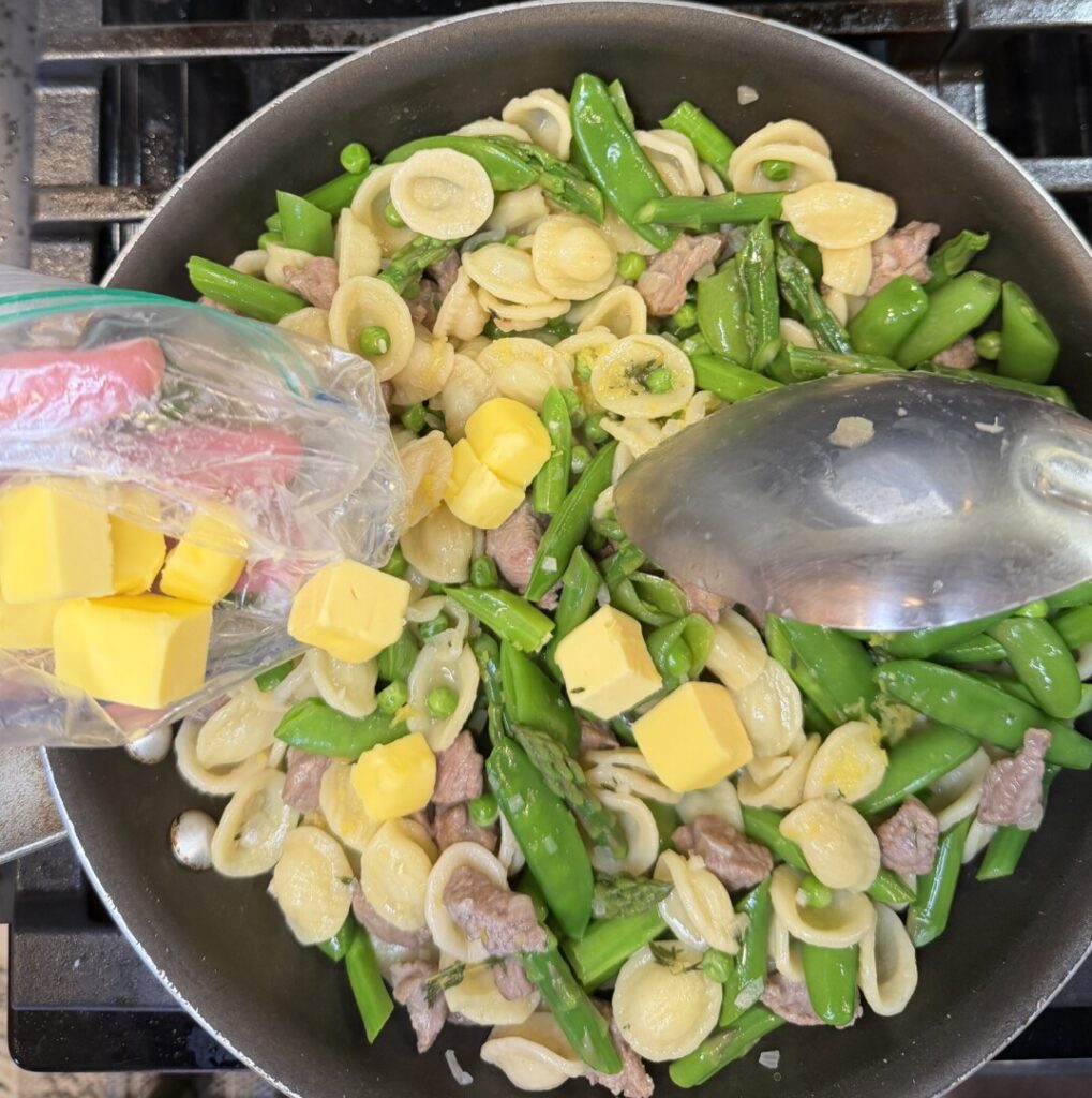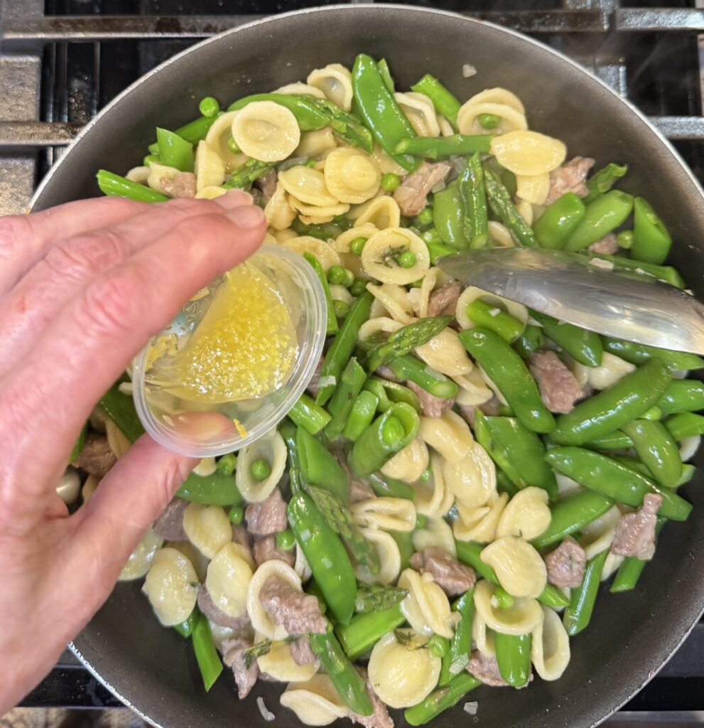 Add the braised lamb and its sauce to the pan, using a plastic spatula to scrape in every bit of sauce. Remove the thyme sprig stem, scraping most of any remaining leaves off the stem and into the pan. Now add the vegetables and stir to combine. Turn the heat to high and stir gently until the vegetables are hot. (If necessary cover the pan for a few seconds to concentrate the heat, but don’t keep the lid on for too long lest the vegetables lose their bright green color.) If the pan seems dry, add a ladle of pasta-cooking water. Now stir in the lemon juice and zest. Turn off the heat and add the cold cubes of butter and toss gently until the butter melts and emulsifies into the sauce. Finally, stir in the cheese which will complete the thickening of the sauce. There should be enough medium-thick sauce to lightly coat the pasta and vegetables with a little left to flow on the plate. If the sauce is too thick, stir in a little more pasta-cooking water. Evaluate the seasoning and, if necessary, add a little more salt and/or lemon juice.