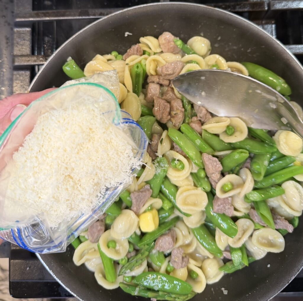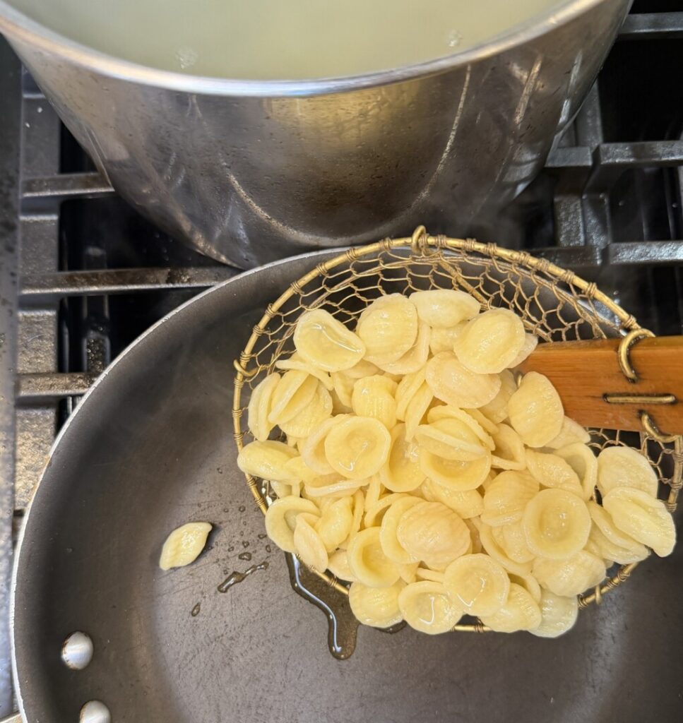 - Place a large nonstick sauté pan over medium heat. Use a “spider” strainer to transfer the orecchiette from the pasta water into the sauté pan, along with the pasta water clinging to it.