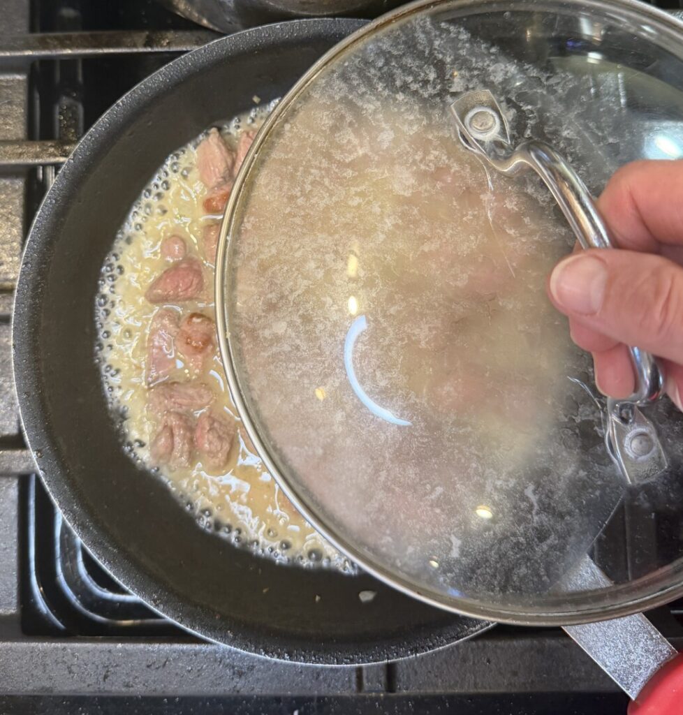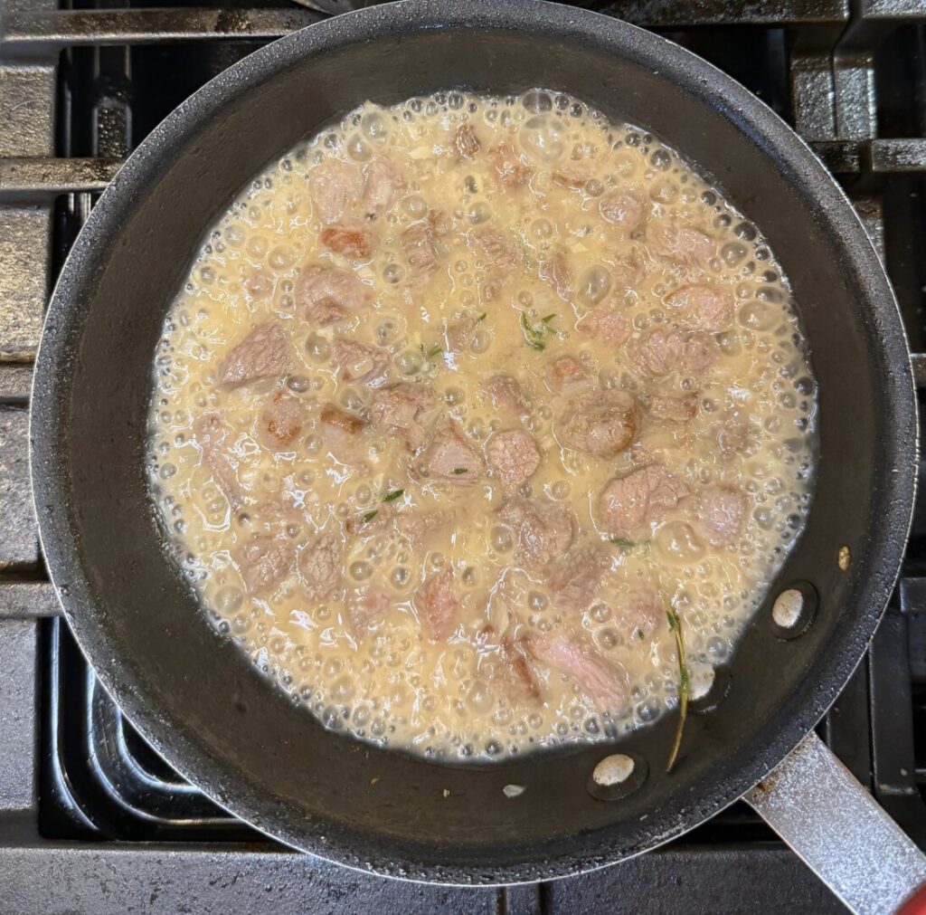 - Return the lamb and its juices to the pan, cover, and simmer for 5 minutes. When done, the lamb should be chewy-tender and the sauce reduced to a lightly-thickened consistency.