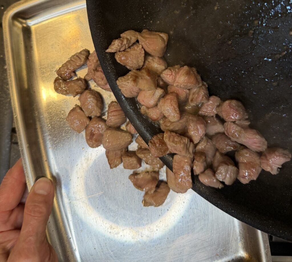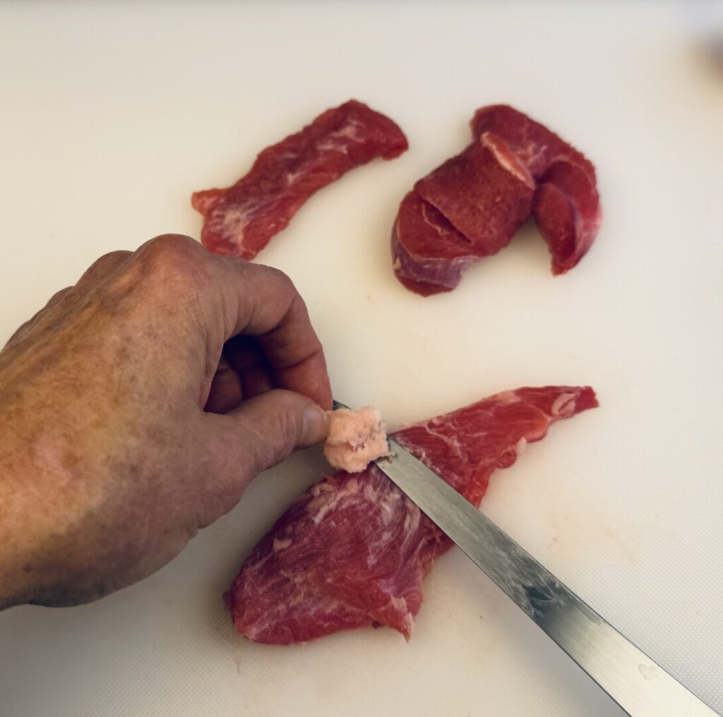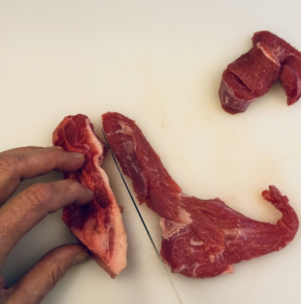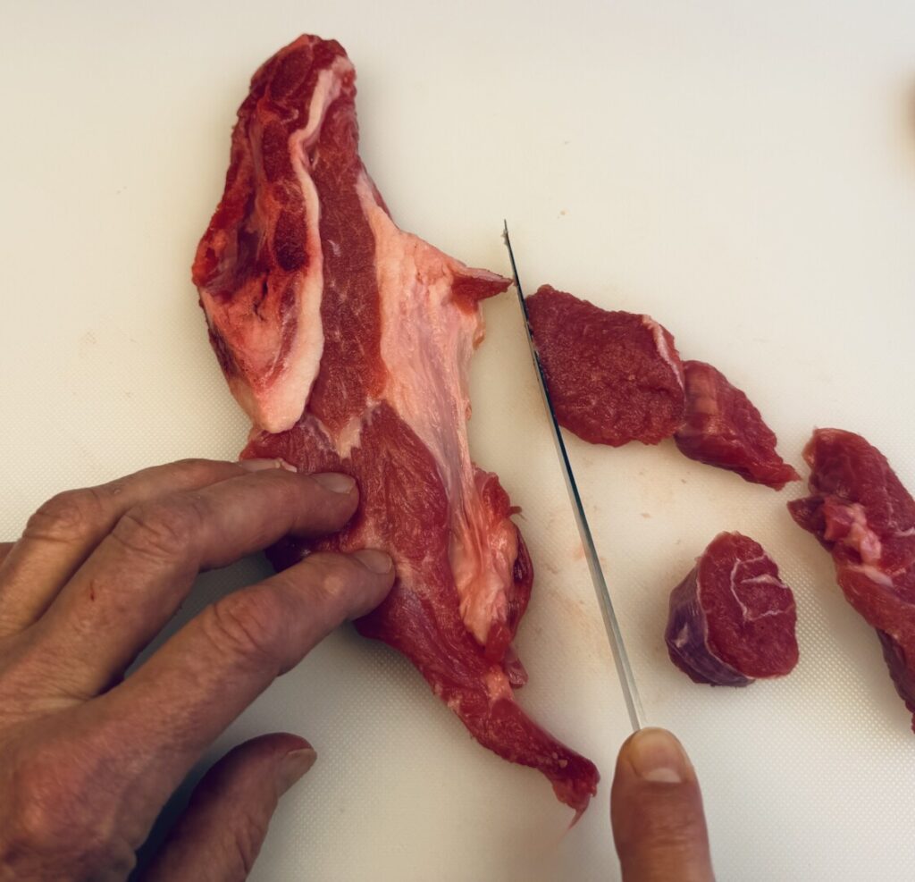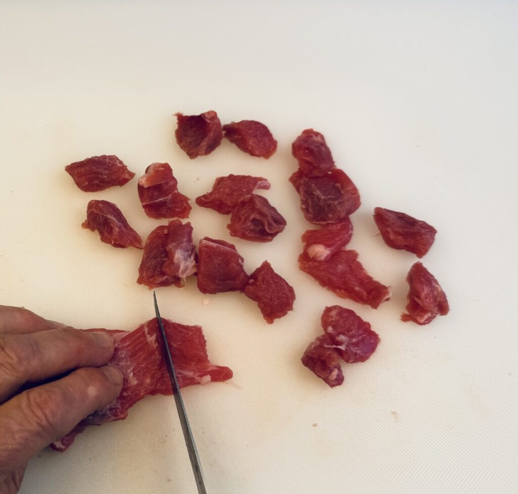 - Cut the meat into ½-inch cubes. You should have about 3 oz clean meat per person.