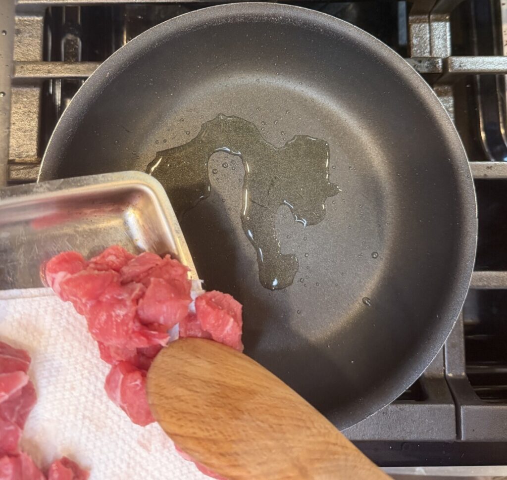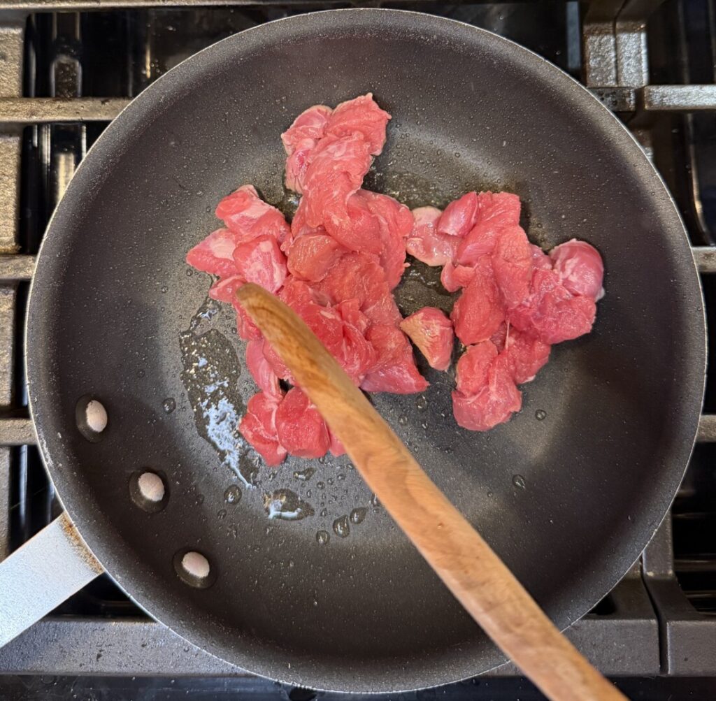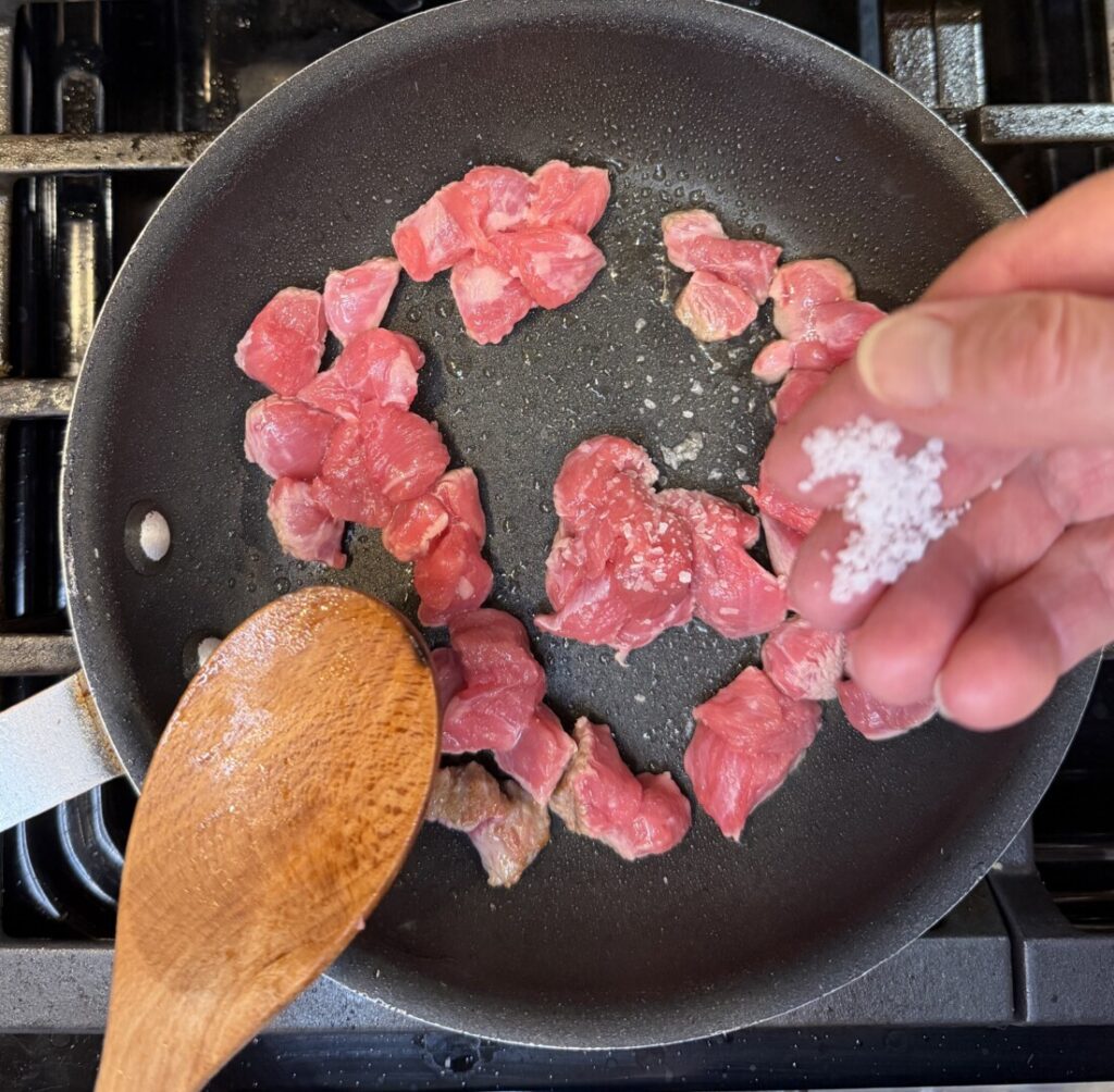 In this recipe the goal is to preserve the naturally mild flavor of spring lamb, so as not to overpower the delicate flavor of the vagatebles. So we’re not marinating or otherwise pre-seasoning the raw meat.