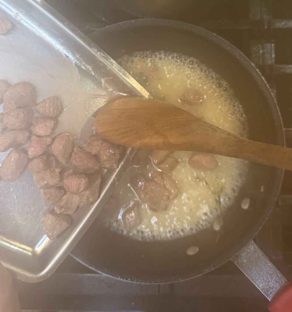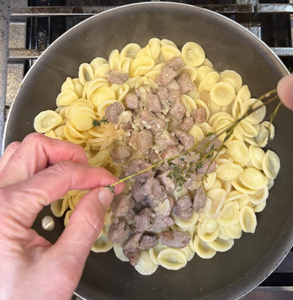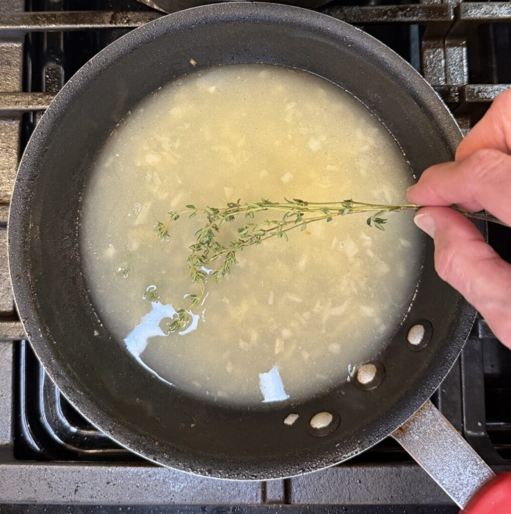 - Remove the thyme stem from the sauté pan, scraping most of the leaves in the sauce.