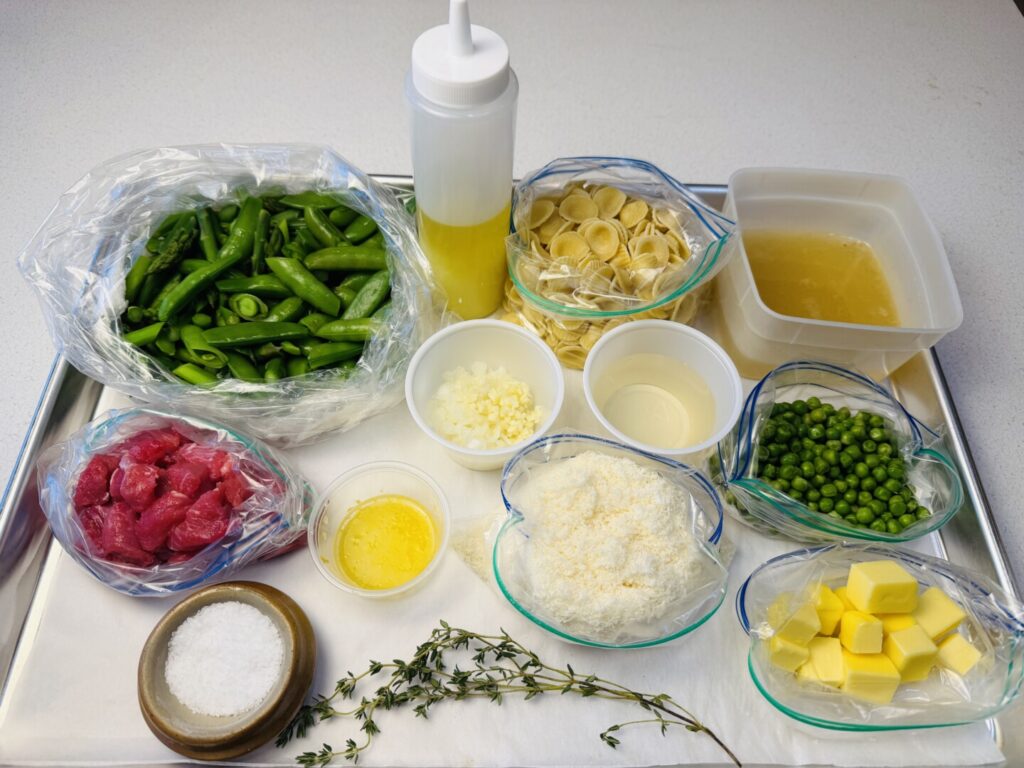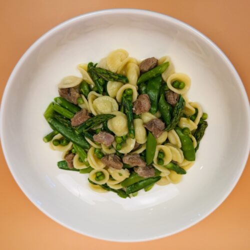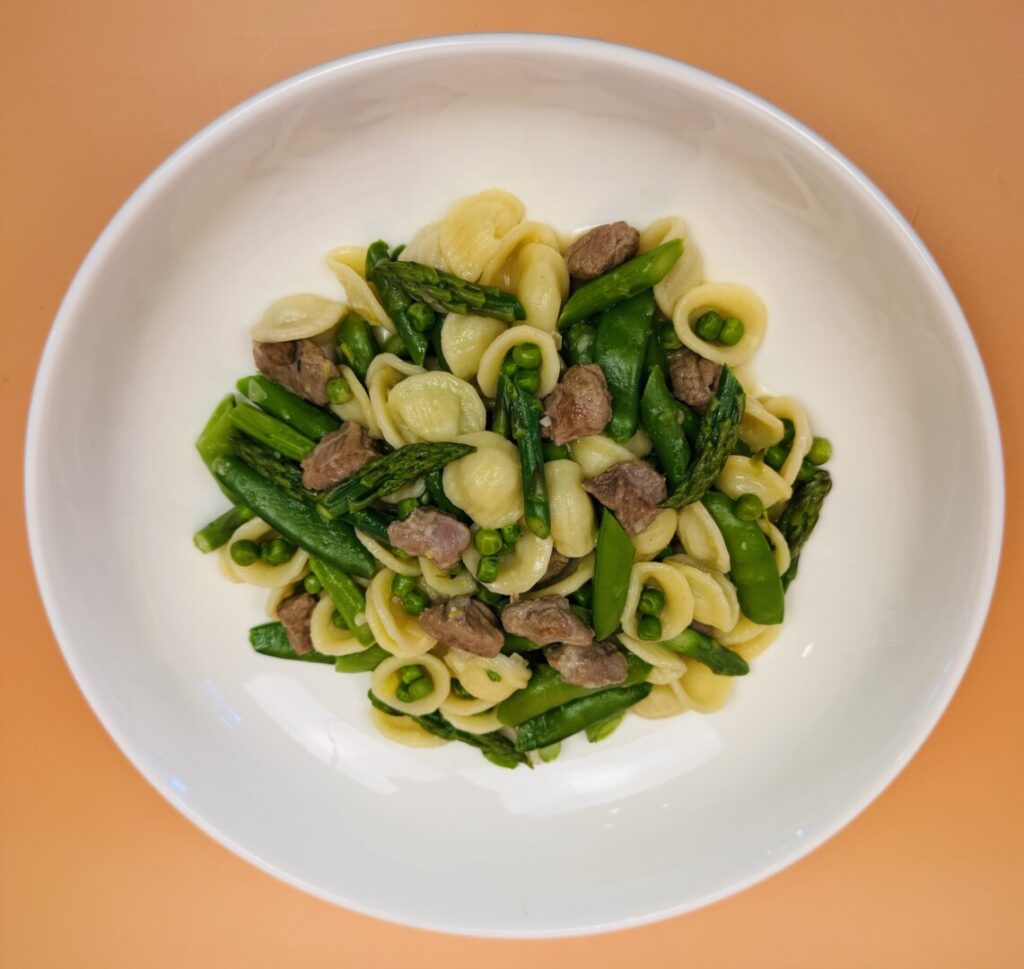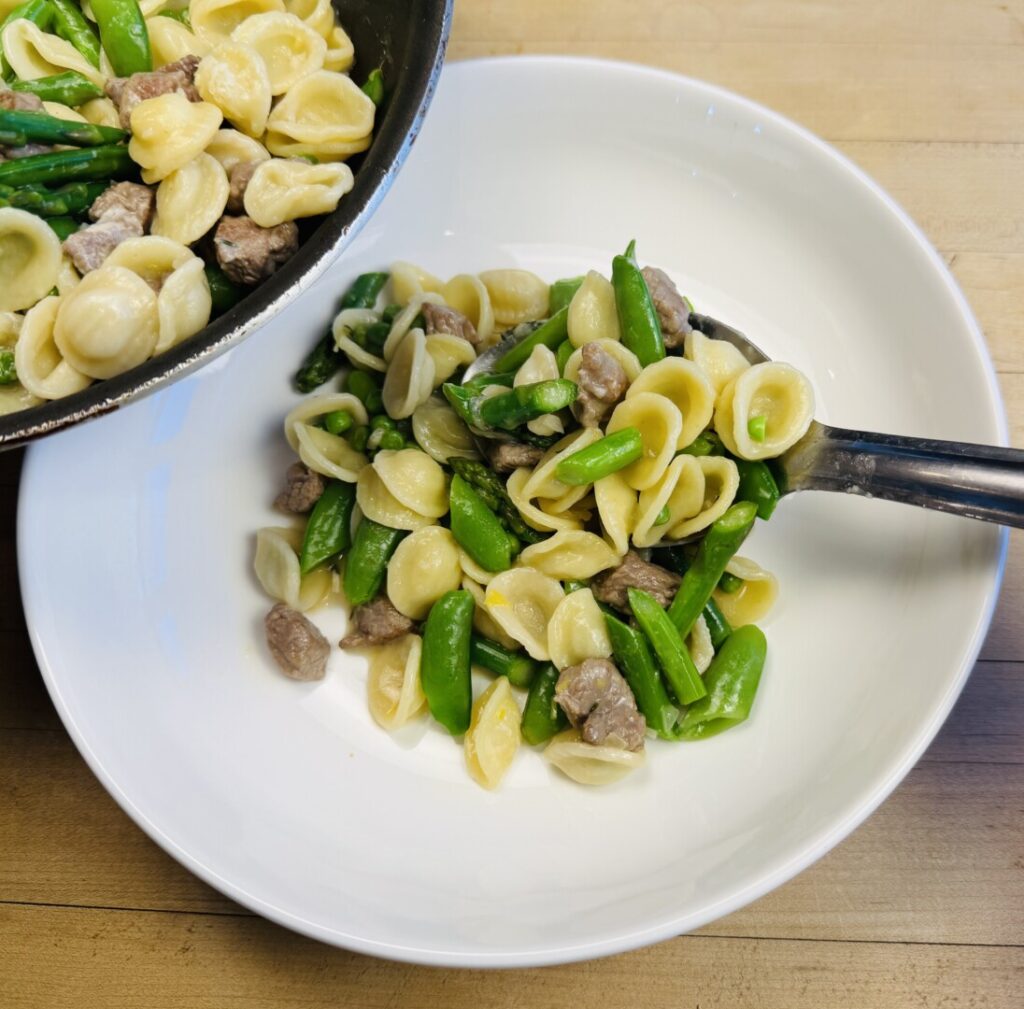 After a long winter of warming, substantial comfort food, early spring brings cravings for lighter, fresher dishes featuring the season’s first green vegetables. This Italian-inspired pasta entrée combines tender cubes of lamb and al dente orecchiette pasta with snap peas, asparagus, and English peas in a lemon-scented butter emulsion sauce enriched with Parmigiano-Reggiano cheese.