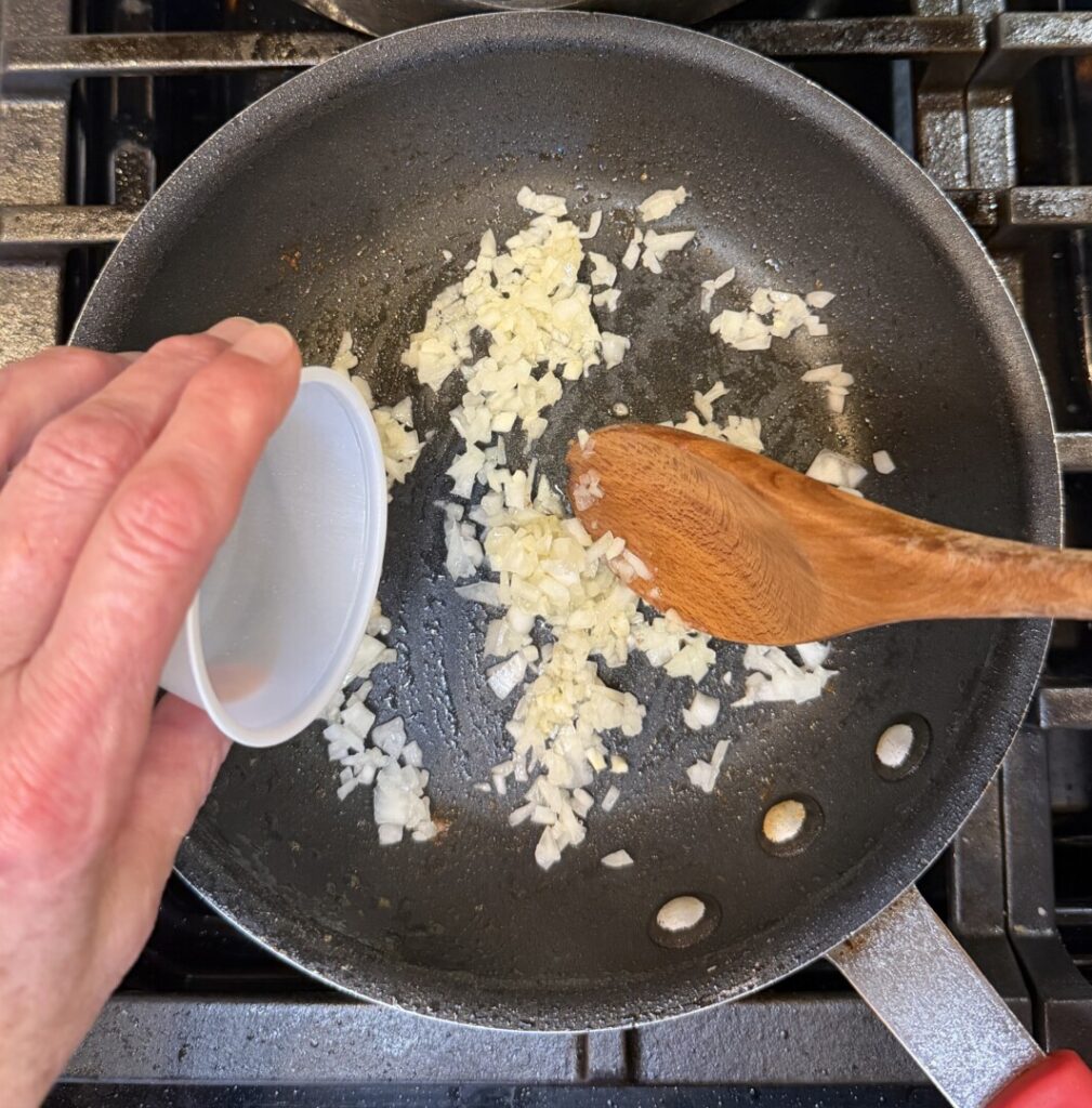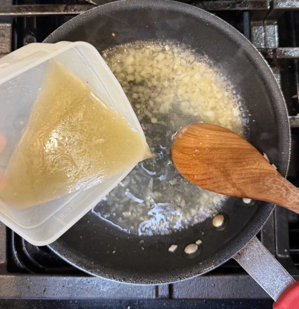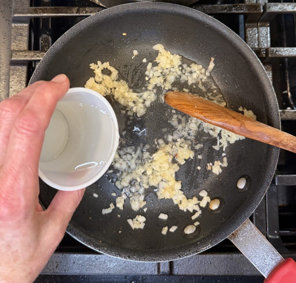 - Lower the heat to cool the pan slightly, and then add the onion and garlic. Sauté for at least 20 seconds until softened, and then add the stock, wine, and thyme sprig. Bring to the simmer, and reduce for about 5 minutes.