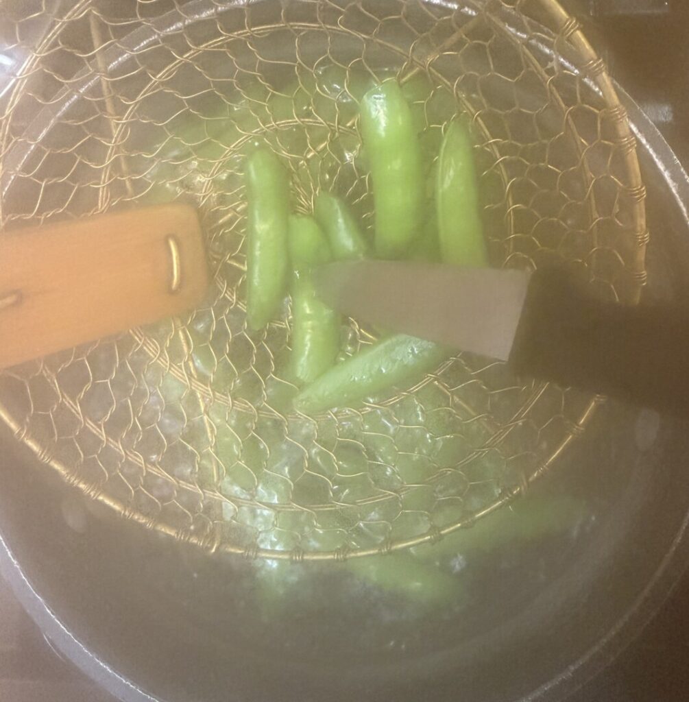 - Drop the snap peas into the water and boil for 30 seconds or longer until a paring knife inserted into a snap pea meets with sight resistance. Use a “spider” strainer to remove the asparagus into the bowl of water, and then place the bowl in the sink under a stream of cold water for a minute or so. Remove from the water and drain on paper towels.