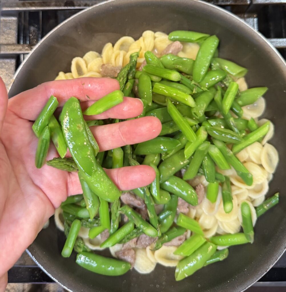 Asparagus and peas are among the first vegetables of spring. Although here in the Mid-Atlantic our asparagus won’t emerge from the ground until the second week of April, and we won’t have mature peas until June, farmers further south in Florida, Georgia, and the Carolinas are beginning their harvests. Though not truly local, this produce at least comes from neighboring plant hardiness zones, giving us permission to cheat the season just a little.