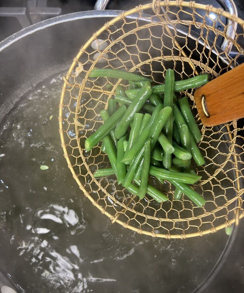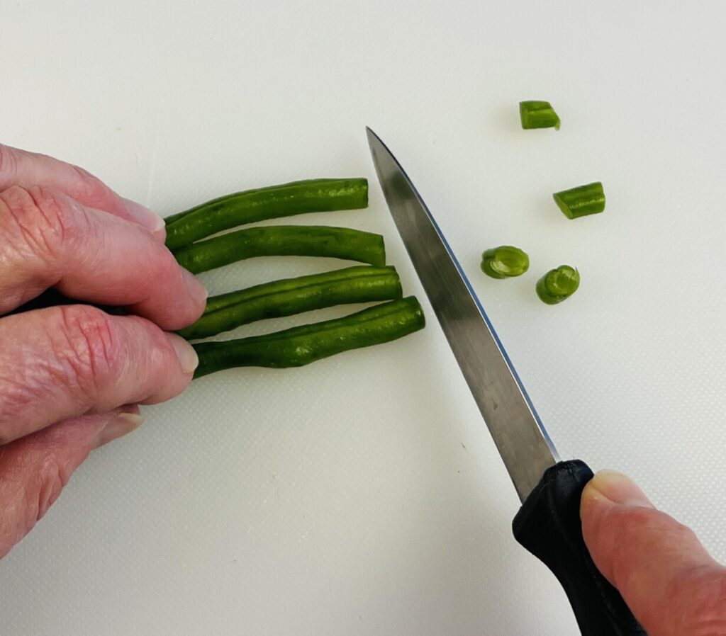 - Trim the ends from the green beans and cut into 1-inch diagonals.