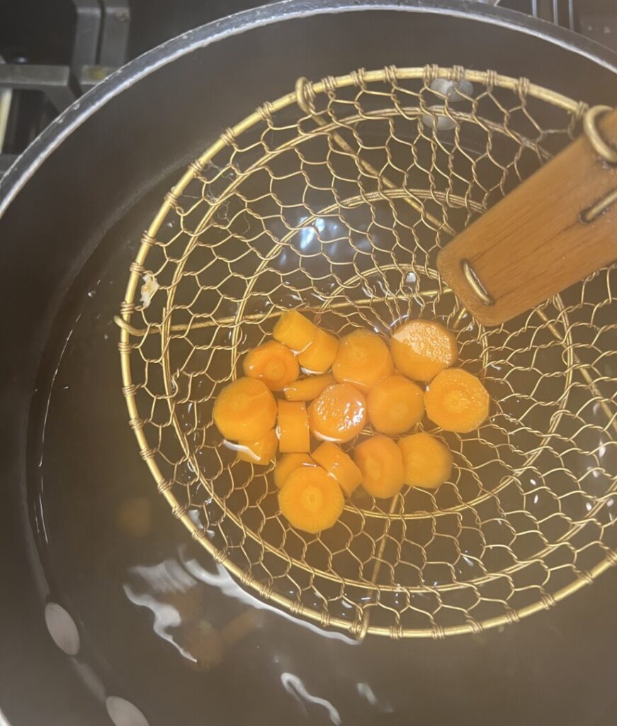 - Working with each type of vegetable separately, immerse the vegetables into the boiling water just long enough for them to cook crisp-tender. (Test by tasting a piece of each type.) Use the strainer to transfer each batch of vegetables into to the cold water, running a thin stream of tap water into the bowl to maintain the cold temperature.