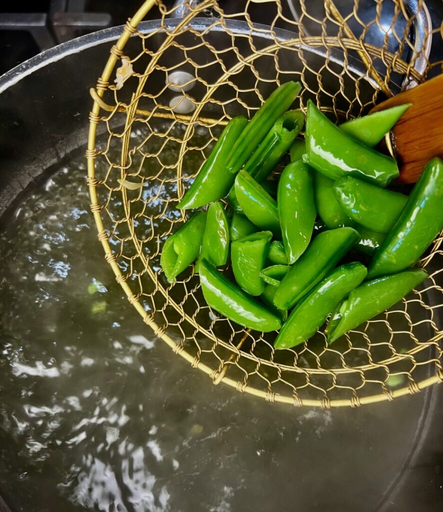 For this recipe we’ll par-cook the vegetables ahead of time, as part of our mise-en-place. I’ve encountered pasta primavera recipes that specify boiling the vegetables along with the pasta. Indeed, this is an efficient idea; however, because each of our vegetables cooks at a different rate, it requires precision timing. After a long day at work I’m simply not up for dealing with that! It’s far less stressful to blanch each vegetable separately to its optimal, al dente texture…