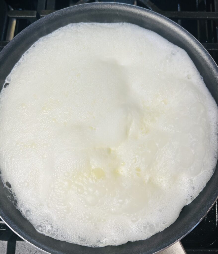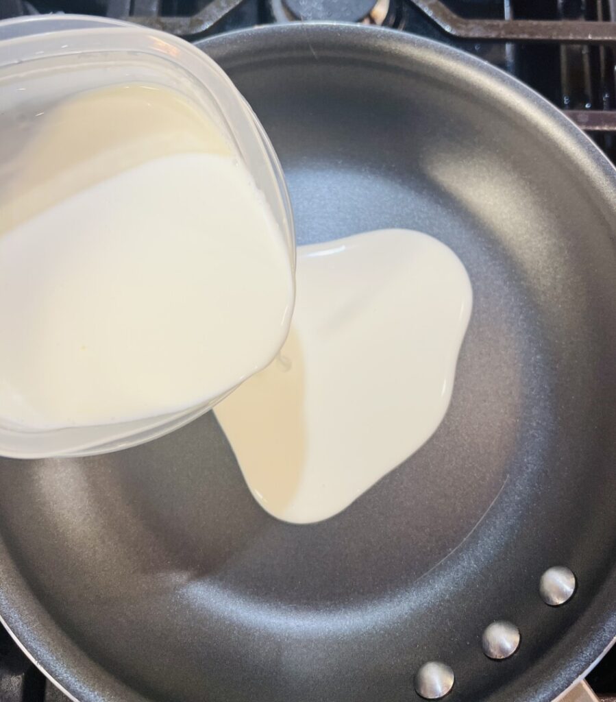 - Add the cream to a nonstick sauté pan and bring to the boil. Reduce to about half its original volume.