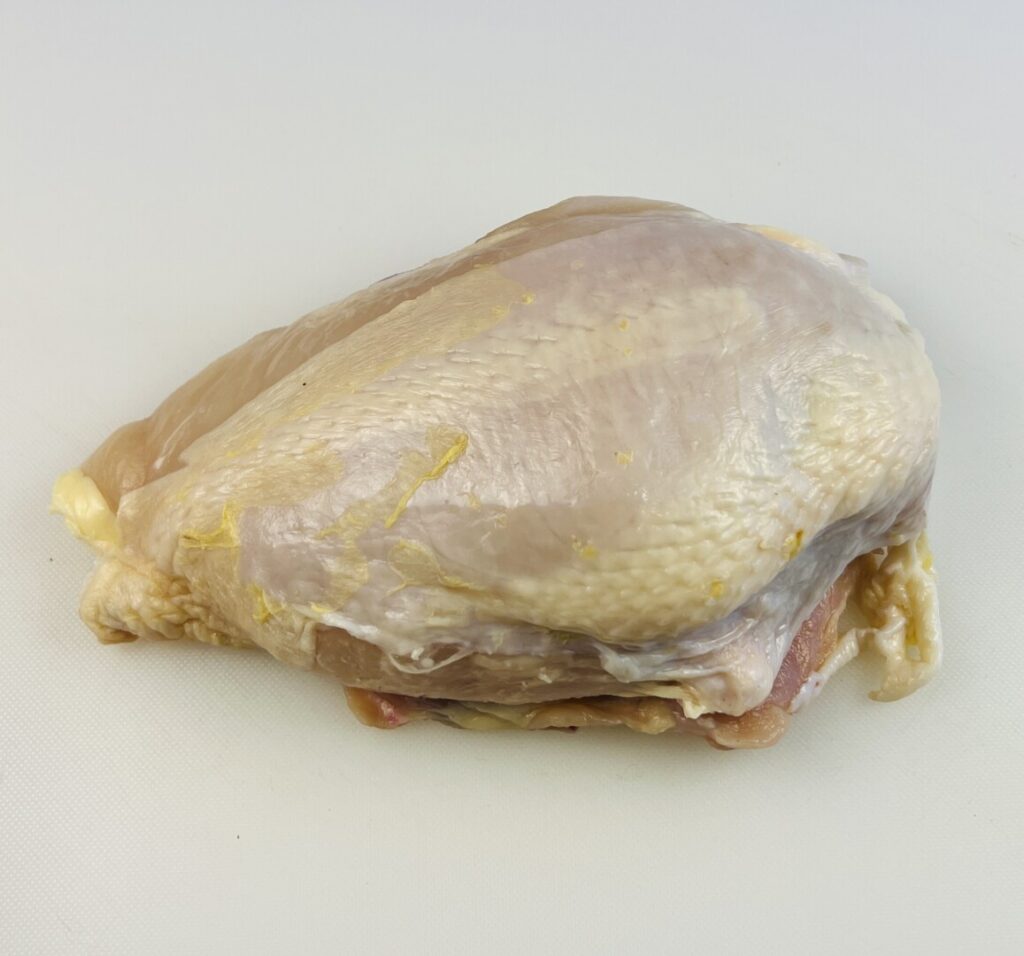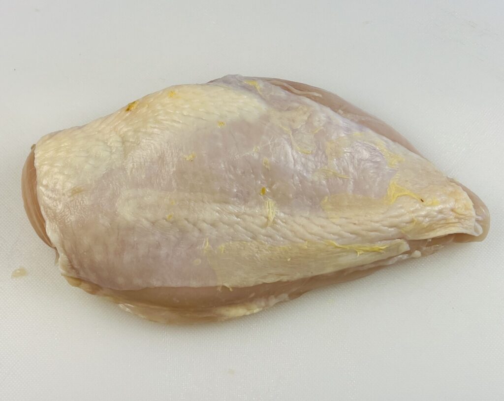 The vast majority of chicken sold in North America is fabricated during processing into boneless, skinless breasts. These typically have little flavor and, because they contain virtually no fat, when cooked to the USDA-required internal temperature of 165°F, they invariably have a dry mouthfeel. As you’ve undoubtably experienced, chicken roasted with the skin on is more moist and flavorful, because the fat in and under the skin creates flavor and succulence. Serious cooks willing to spend some time on poultry fabrication purchase whole fryer chickens and break them down into skin-on legs, breasts, and stock bones. However, this requires skill and time. I recommend a middle-of-the-road option: Buy bone-in, skin-on split chicken breasts, and remove the bones. Because these are usually cut from large, more mature chickens, one breast half yields enough meat for two entrée portions.