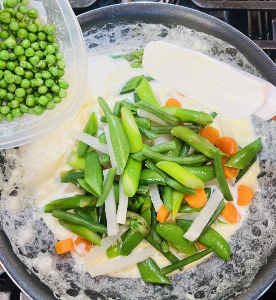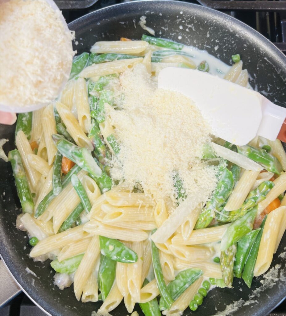 - Turn off the heat and fold in the cheese. The sauce should thicken around the vegetables. Once the cheese is in the sauce, don’t return the pan to heat.