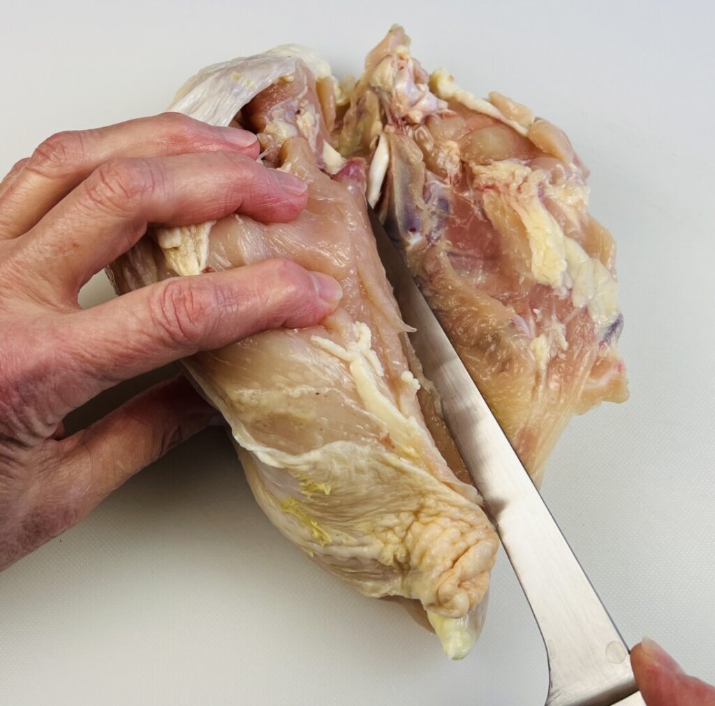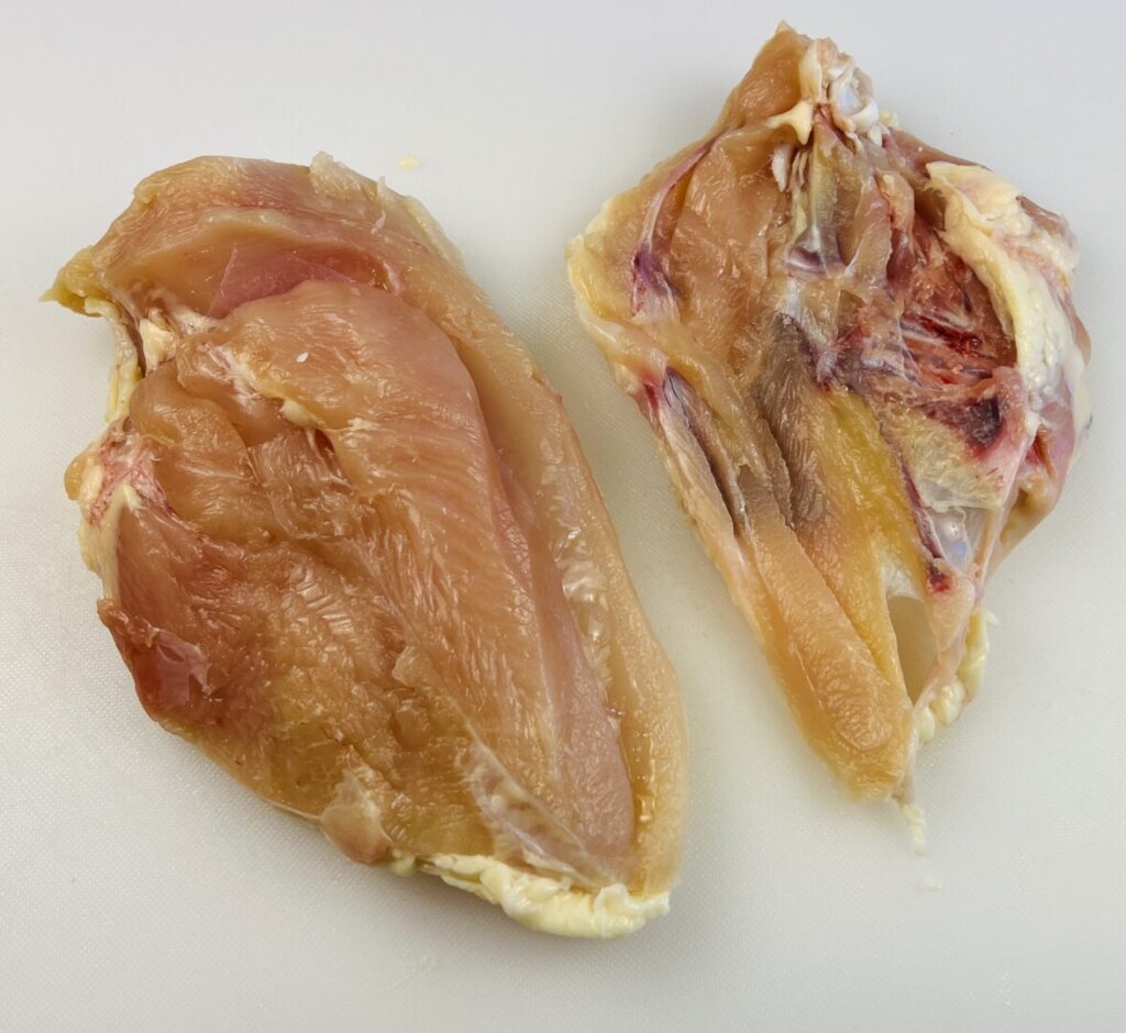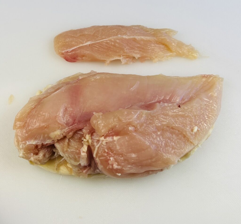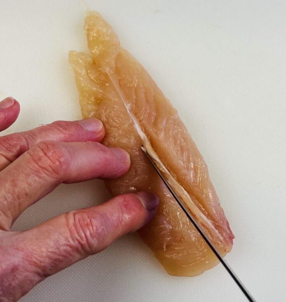 With the now boneless breast on the cutting board skin-side-down, trim away any excess skin and fat. Make sure to leave enough skin on the breast to completely cover the breast meat. When you did the initial boning out, if you’ve cut accurately and close to the bones, the chicken tender will be intact against the larger breast lobe. Because the tender usually overcooks when left on the breast, it’s best to remove it and reserve it for another use, such as in a stir-fry. You can keep a plastic bag for chicken tenders in the freezer and “collect” them until you have enough to cook. As you can see in the photos, a chicken tender contains a tough, white tendon running vertically through it. It’s an efficient, time-saving practice to remove the tendon before freezing so you don’t have to dirty a knife and cutting board when you’re ready to cook the tenders.