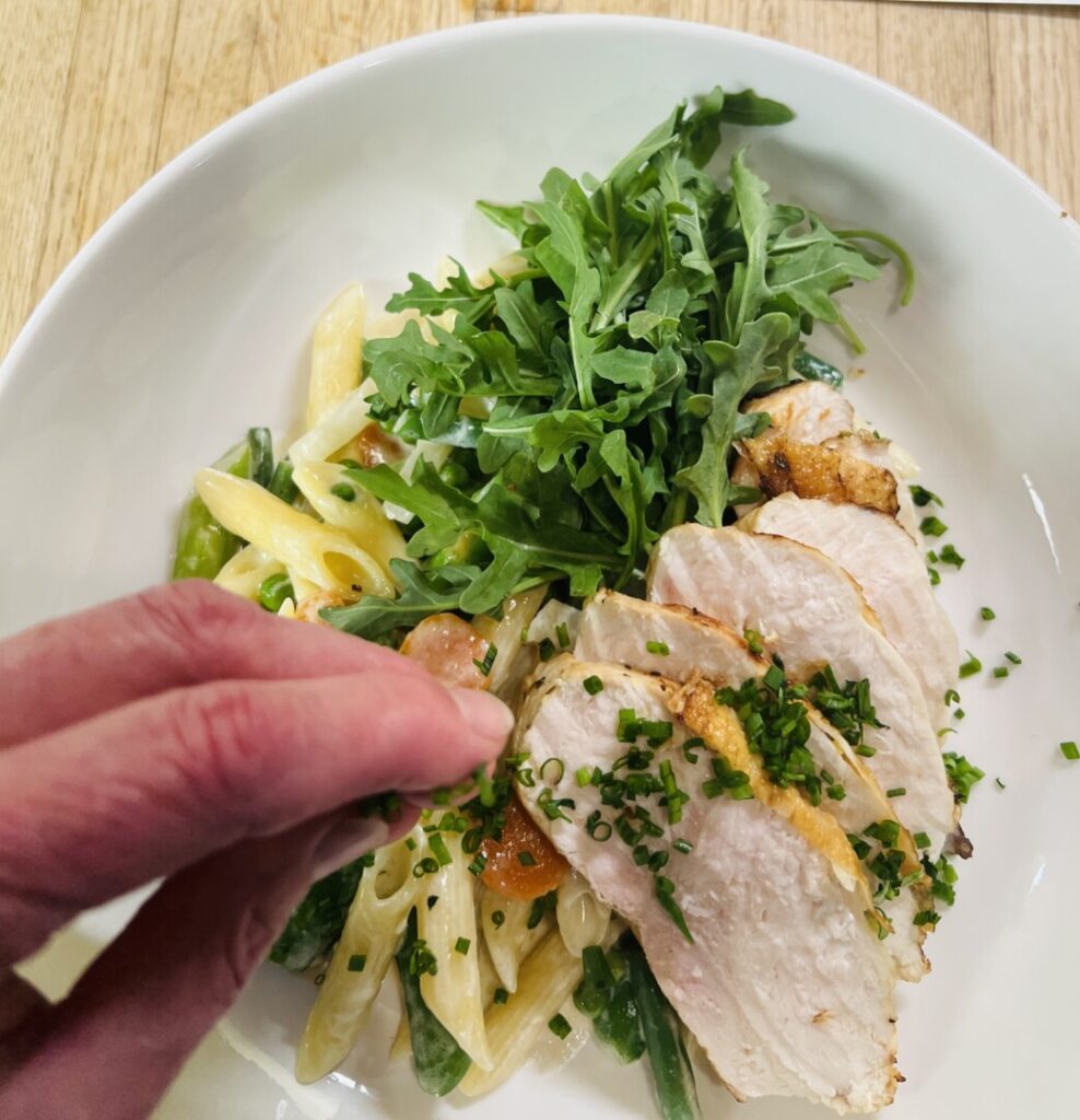 Now you’re ready to plate. First, mound the penne on the left front of a warm pasta bowl, and plant a bouquet of baby arugula at the back. The arugula adds a cool, crisp mouthfeel element and a subtle bitterness that pleasantly contrasts with the creamy sweetness of the pasta sauce. It also adds the dimension of height to your presentation. Use a chef’s professional technique to plate the chicken: Slide your knife blade under the lined-up slices, steady the slices with your tongs, lift, and transfer the slices to the plate. Fan the slices attractively against the arugula and on the pasta. Finally, sprinkle a line of chives across the plate.