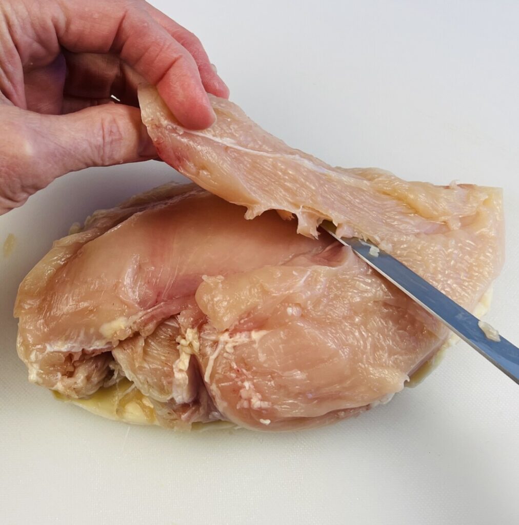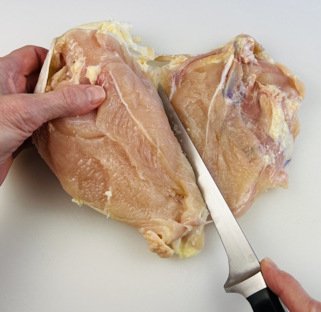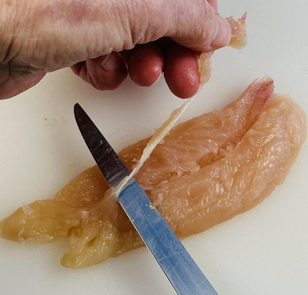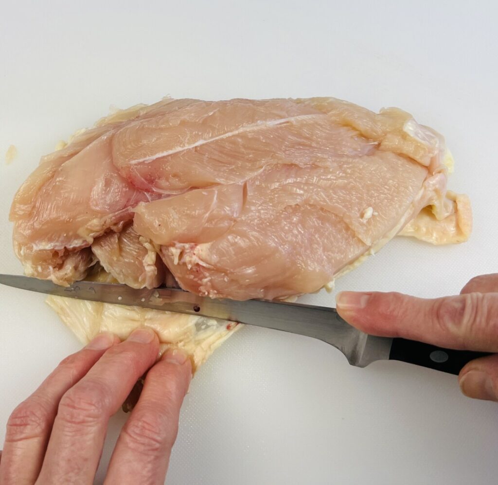 - OR—If using boneless, skinless chicken breasts, trim away any connective tissue and fat.