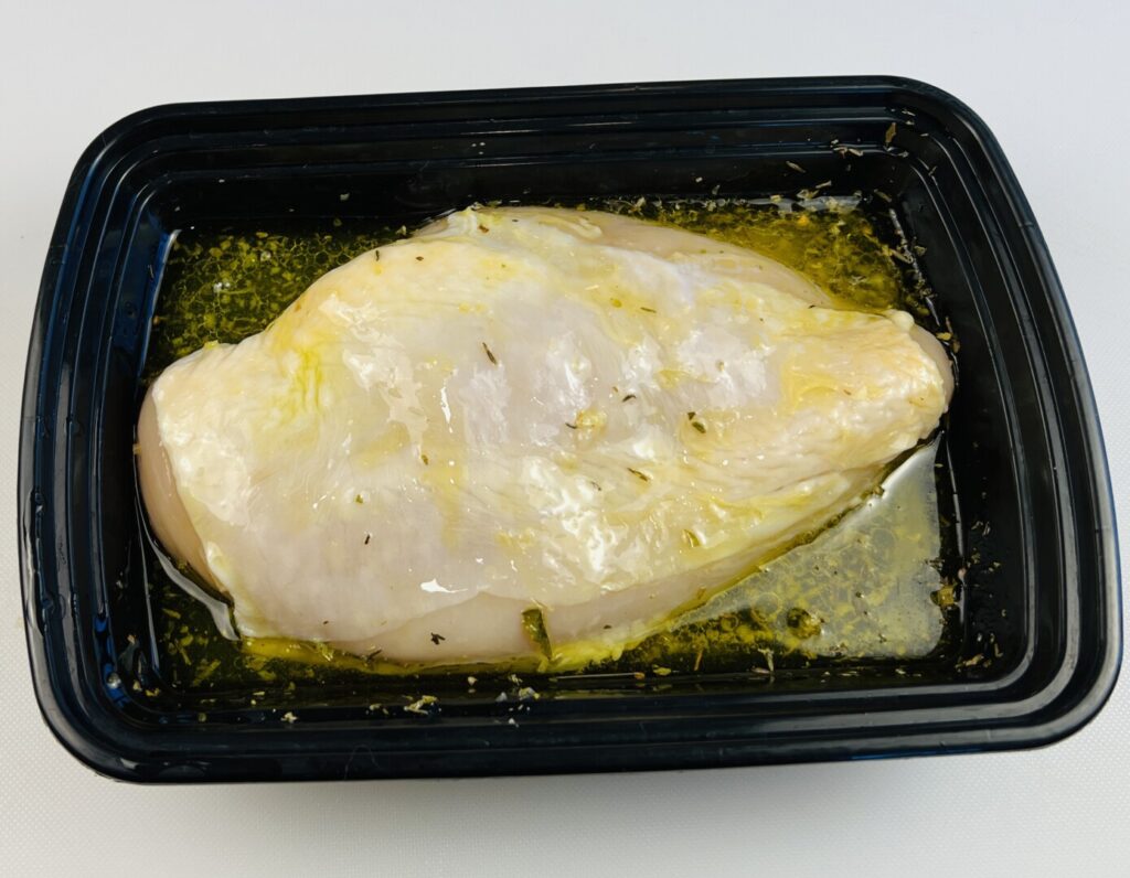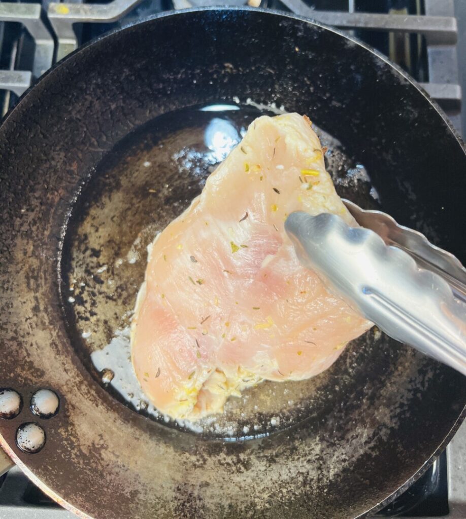 By definition, marinades include an acidic ingredient, salt, oil, aromatic vegetables, and seasonings such as herbs and spices. The acidic ingredient—in this case lemon juice—not only adds flavor but also tenderizes by breaking down the meat fibers. For tough cuts of meat, marination provides much-needed tenderization. But for our already-tender chicken breast, we don’t need tenderization, we want only the lemon and other flavors to permeate the meat. So it’s important to not leave the chicken in the marinade too long. If you do, your cooked chicken breast will have a dry, cottony mouthfeel. Observe the marination times specified in the recipe, removing the chicken from its marinade and storing the chicken and marinade separately until needed.