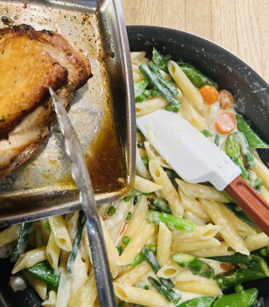 Chefs never throw away flavor! Although classic primavera is a vegetarian dish, if you’re serving it with chicken anyway, let’s add the tasty jus from the chicken roasting pan into the sauce.