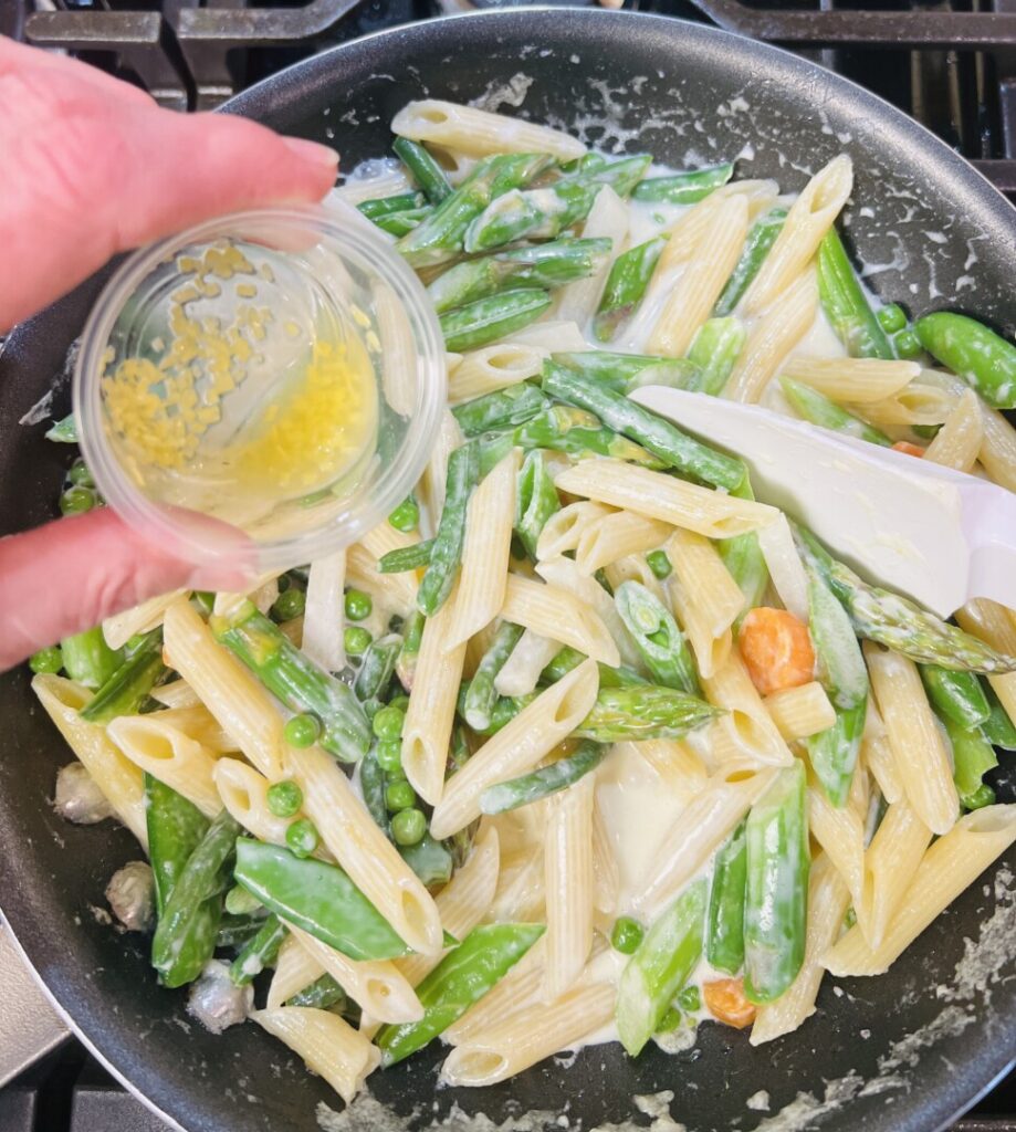 - Add the lemon juice and zest, then add the primavera vegetables and some salt.