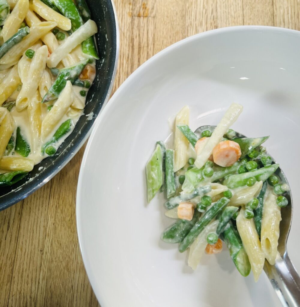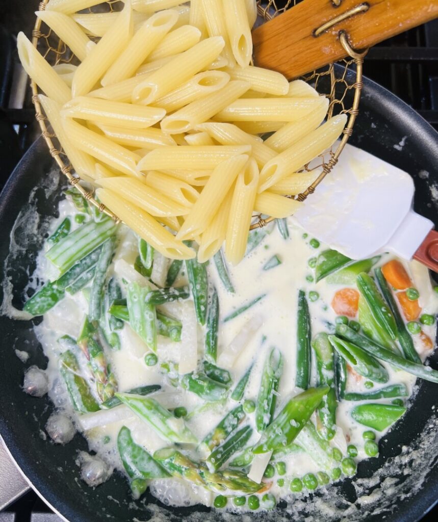 - Use the “spider” strainer to transfer the penne into the sauté pan with the cream and vegetables. (Some of the hot pasta cooking water will come along with the penne; this is necessary.) Keep the pasta water at the simmer.
