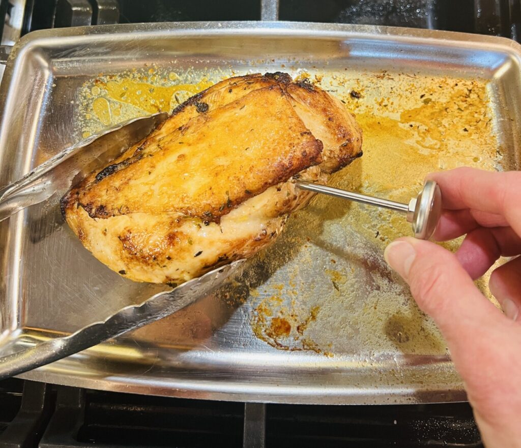 The chicken breast is done roasting when the internal temperature reaches 160°F. Once out of the oven, carryover cooking will raise the temperature to the required 165°F. Hold it on the back of the stove until you’re ready to plate. As the oven’s heat penetrated the interior of a roast, it forced the meat’s juices into the center. Resting the chicken breast before slicing it allows the juices to permeate back into the meat so that every bite is juicy.