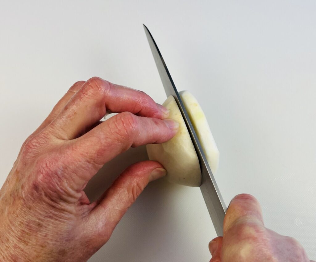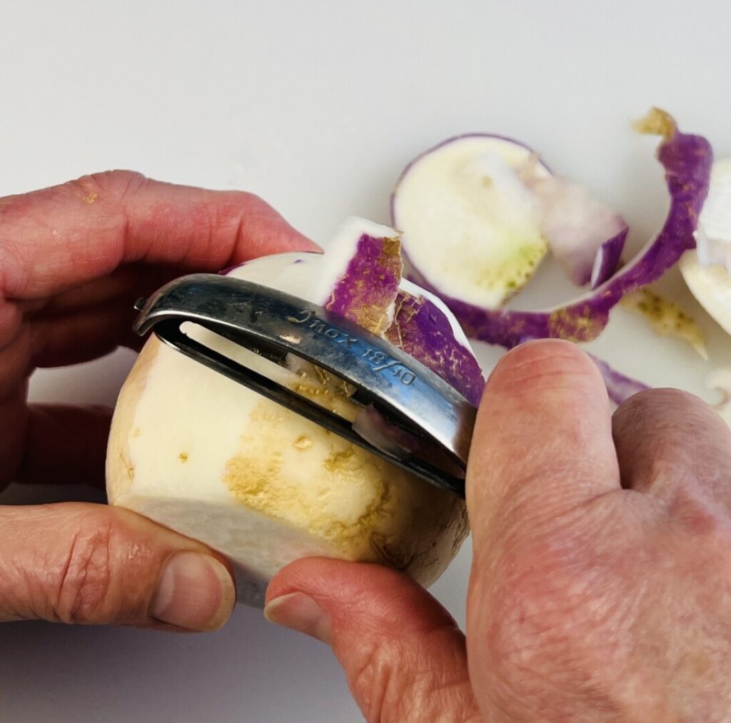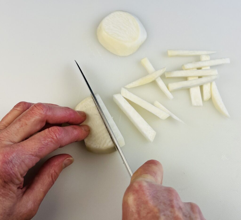 - Peel the turnip and cut into small batonnets (¼ x ¼ x 1 ½ inch).