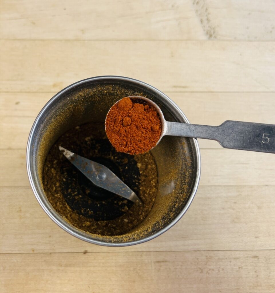 - Scrape the ground spices into a small container and then stir in the step 1 Kashmiri chile powder or hot paprika, the pepper, and the salt. (Don’t wash the sauté pan or grinder, as you’ll be using them in the following step.)