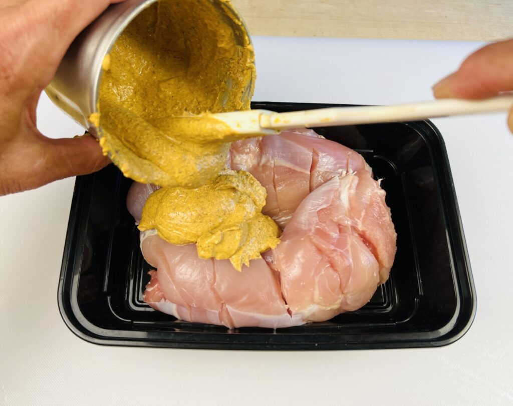 The tandoori marinade contains significant amounts of yogurt and lemon juice, both strongly acidic ingredients. Meat and poultry flesh is comprised of microscopic protein chains that, when the meat is raw, are formed into coiled shapes that hold the meat fibers together and give it structure. Acids act to denature these proteins, causing the coiled chains to gradually unfurl and soften the texture of the meat. We call this effect “tenderization.” Whereas a little softening results in tenderness, exposing the flesh to acidic ingredients for too long a time breaks down the structure too much and results in an unpalatable mushy, cottony texture. So it’s important not to over-marinate. A 12-oz skinned and scored chicken leg should not remain in the tandoori marinade longer than 24 hours. If you are prepping further than one day ahead, make sure to remove the chicken from the marinade after 24 hours and store chicken and marinade separately until needed.