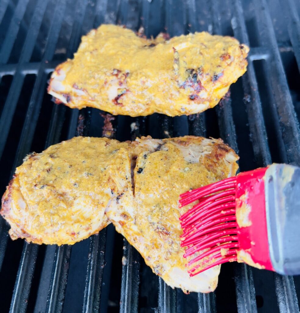 - Mix the remaining butter (and the watery milk solids at the bottom of the container) into the reserved chicken marinade. Coat the top surfaces of the chicken legs with a thick layer of marinade. Close the lid of the grill. (If you’re using a charcoal grill with no lid, transfer the thighs to the sizzle pan and place it in the oven.)