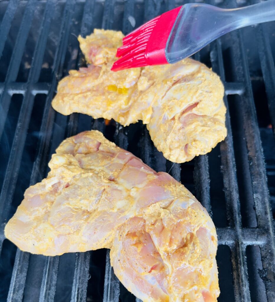 If necessary, use a grill brush to scrape any carbonized food particles off of the grill grids. Because of its thick, protein-based marinade, tandoori-style chicken sticks to grids more than chicken in oil-based marinades.