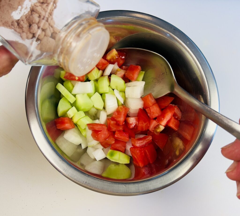 Although you can use ordinary salt to season kachumber, using South Asian black salt really adds a special flavor. Not actually black in color, black salt ranges from tan to muted pink depending on the source. This salt is evaporated from saline lake water and then packed into clay vessels and fired in a furnace. The process creates a change in the salt’s chemical composition, giving it a slightly sulfurous aroma and a savory, funky, umami taste. It’s somewhat of an acquired taste, but those who first like it soon love it. If you have an adventurous palate, buy some at a South Asian market or order it online.