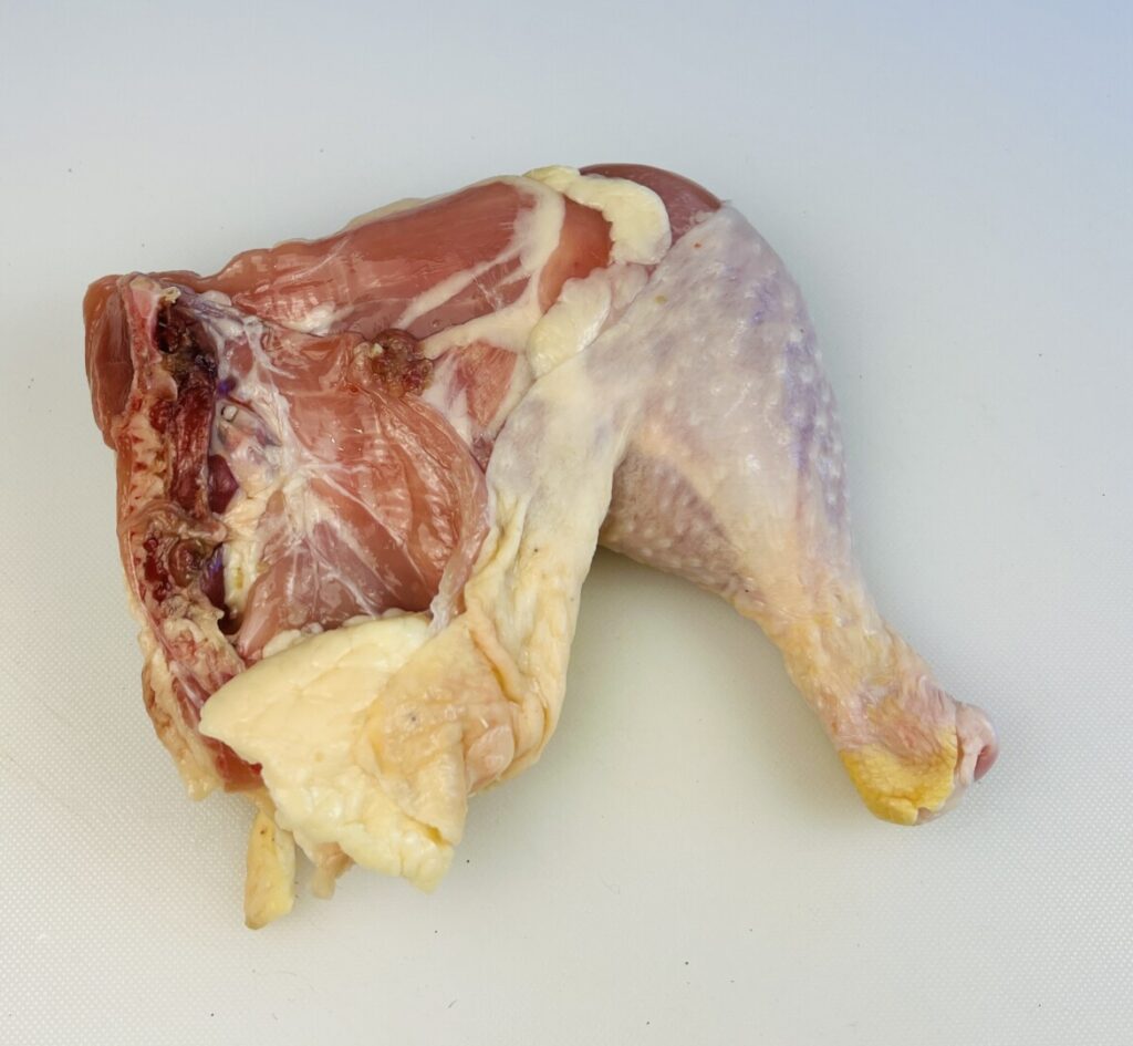 However, in some areas it’s difficult to source whole legs. In their place, supermarkets sometimes offer chicken leg quarters. This cut comprises not only the thigh and drumstick, but also part of the backbone and pelvic bone. Leg quarters can be left intact for grill-roasting, but doing so will slightly increase the cooking time. Moreover, the additional bone structure makes this cut more difficult to eat and leaves behind a lot more bone detritus on the plate. If you can find only leg quarters in your store, you can learn how to fabricate them into chicken legs by following this link: https://prepholdcook.com/tutorials/how-to-fabricate-a-chicken-leg-from-a-chicken-leg-quarter/