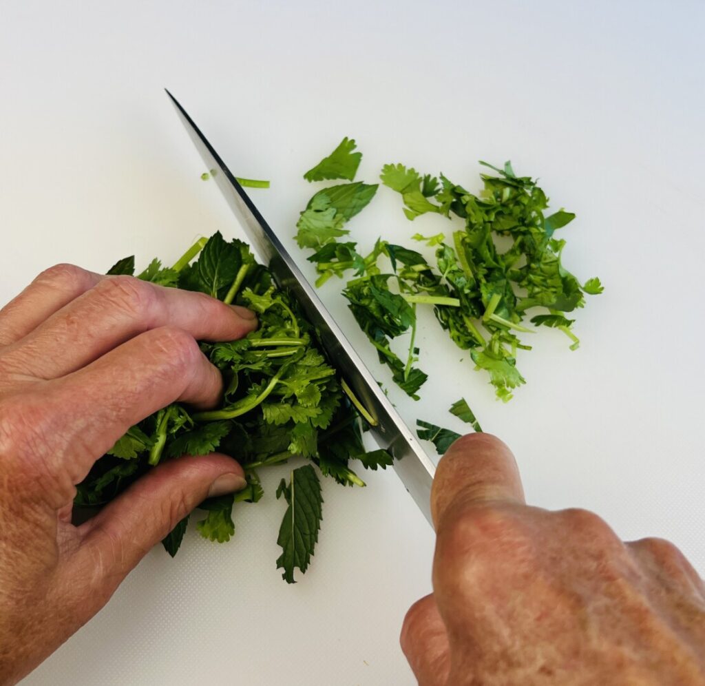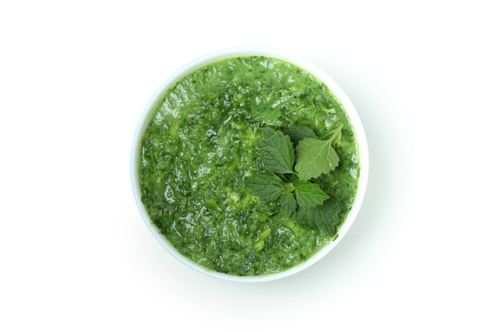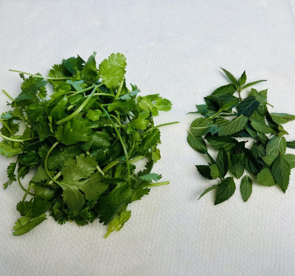“Green” chutney is made with fresh herbs and fresh green chiles. The most popular green chutneys are made with mint, cilantro, or a combination of both. Traditionally, fresh chutneys are made by grinding with a mortar and pestle. Today their preparation is made much faster and easier with an electric wet-dry spice grinder or, for larger quantities, a blender.