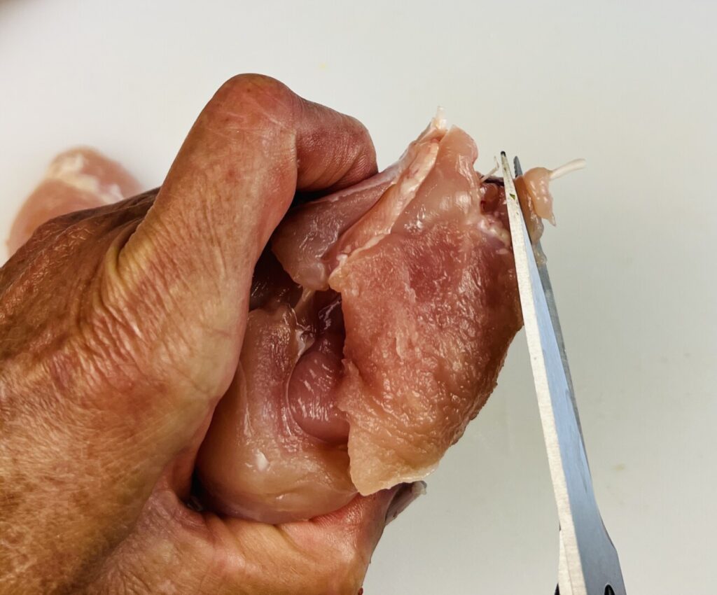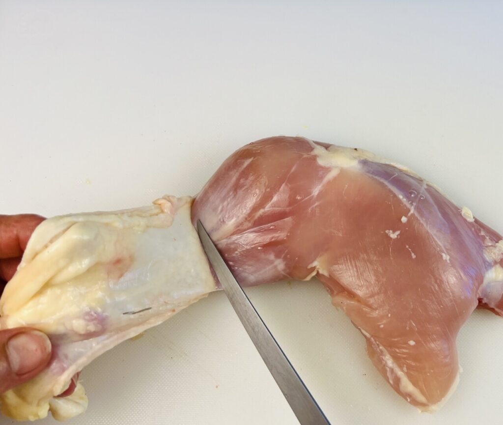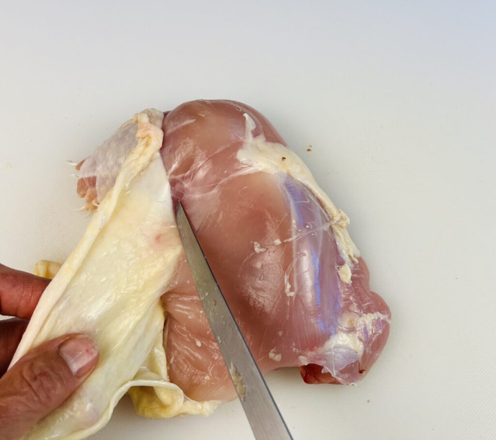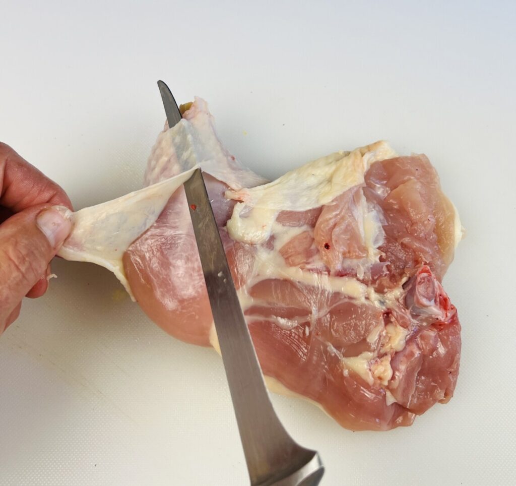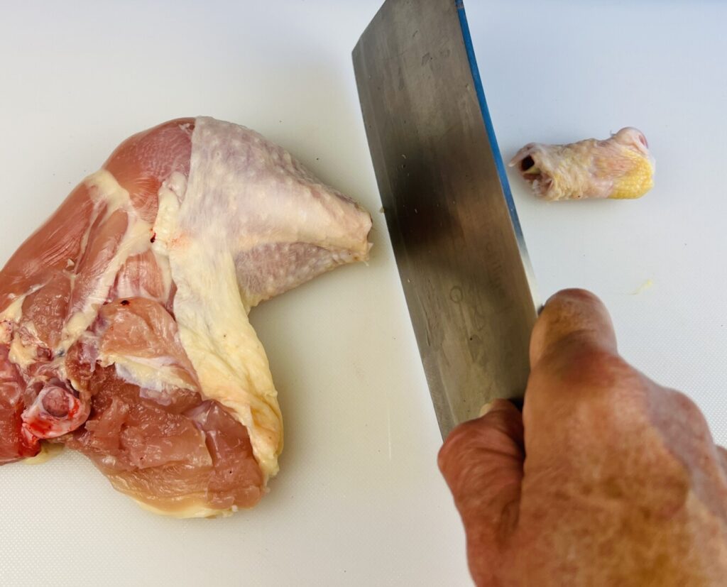 - If using chicken legs, remove the skin and trim away any visible fat and membrane. If using chicken leg quarters, remove the backbone. (If necessary, use the link in the lesson section of this post to visit a tutorial.) Then remove the skin and trim away any visible fat and membrane. Optionally, chop off and discard the knuckles, as shown in the lesson section of this post.