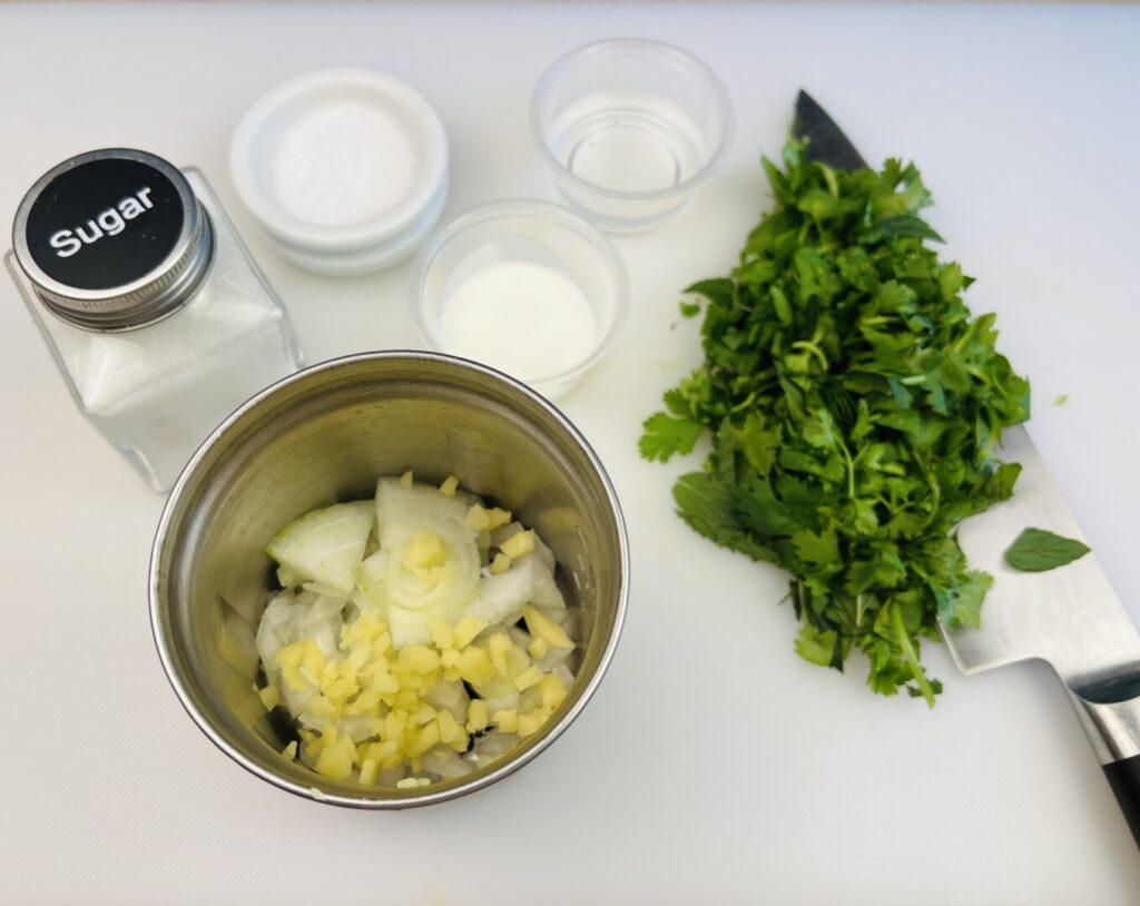 To make green chutney first wash the cilantro and mint leaves, then blot dry. Chop coarse, and add to a wet-dry spice grinder or small blender along with chopped sweet onion and ginger. Add salt, sugar, and yogurt, then blend. The hotness of any chutney is a personal preference, and the hotness level of chiles varies widely. So start with a little and then add more to your taste. Clean and mince a fresh green chile, such as a serrano or jalapeño, and then grind some into the chutney until you like the taste. Correct the salt and sugar if necessary. If you’re storing the chutney longer than 24 hours, freeze it.