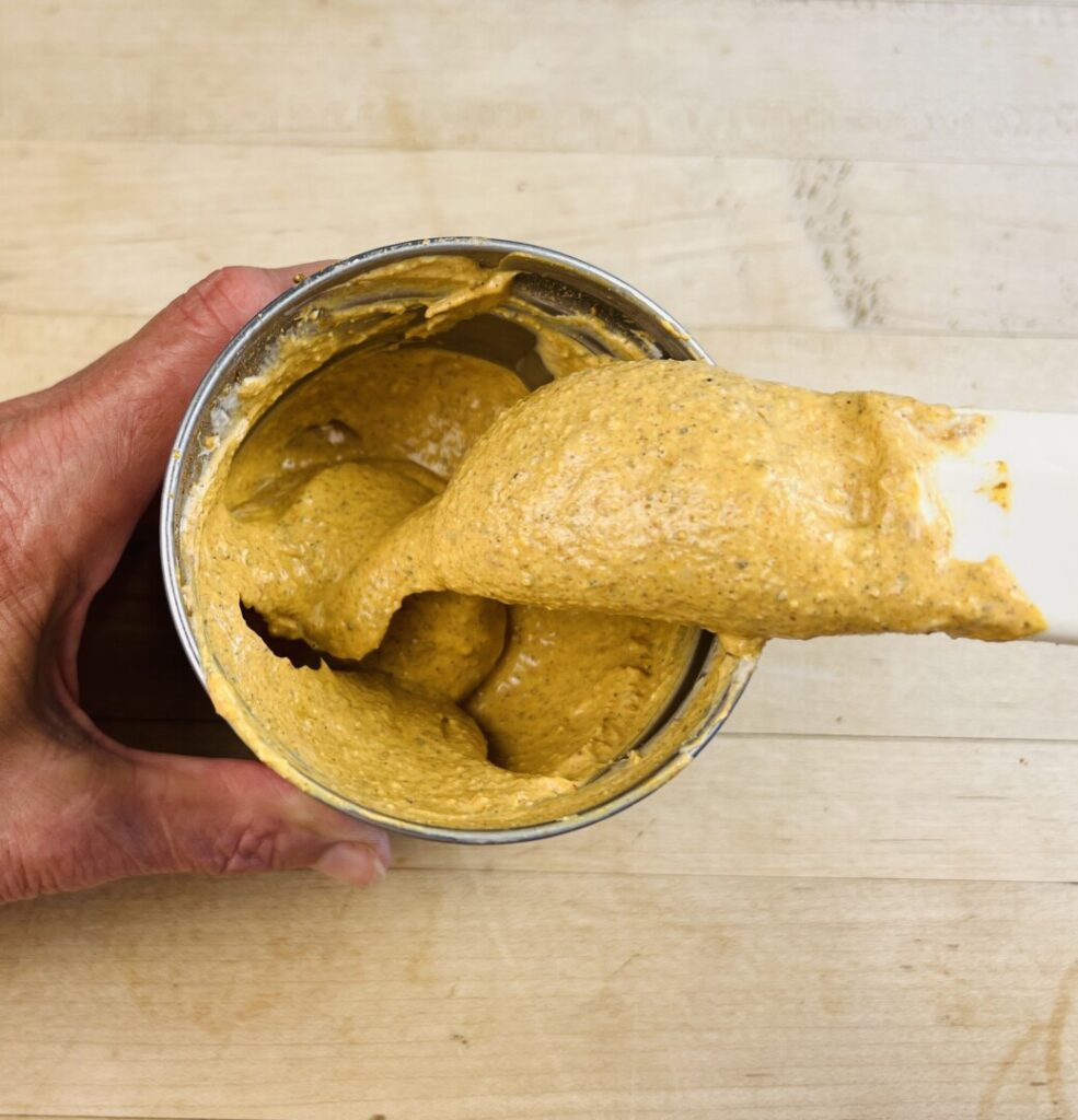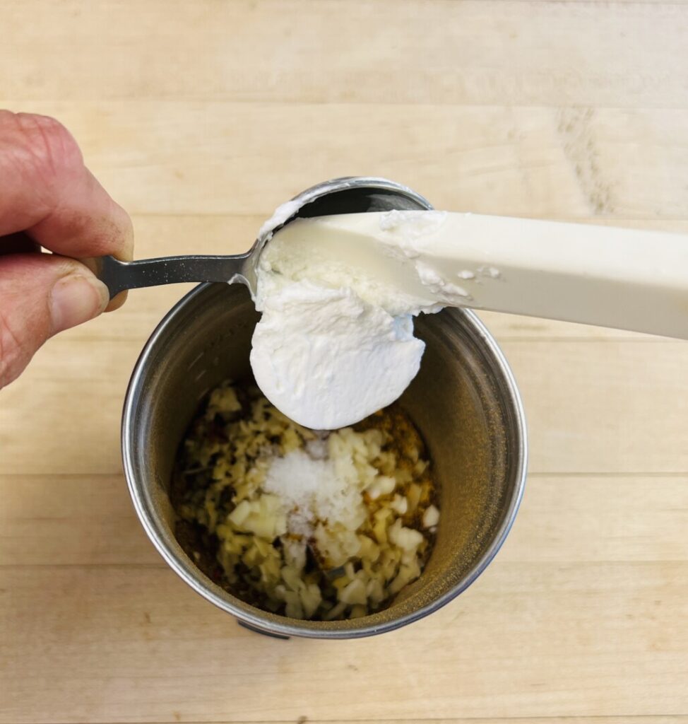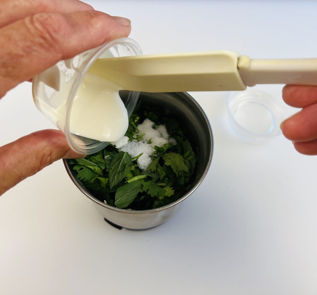 - Remove and reserve 1 ½ tsp yogurt from the yogurt container (for the chutney), and then add about 1/3 of the remaining yogurt to the grinder. Grind into a coarse purée.
