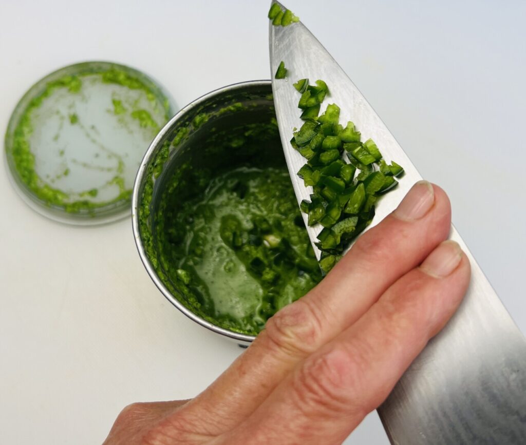- Remove the seeds and veins from the serrano chile, chop it and add some of it to the grinder. Purée the mixture.