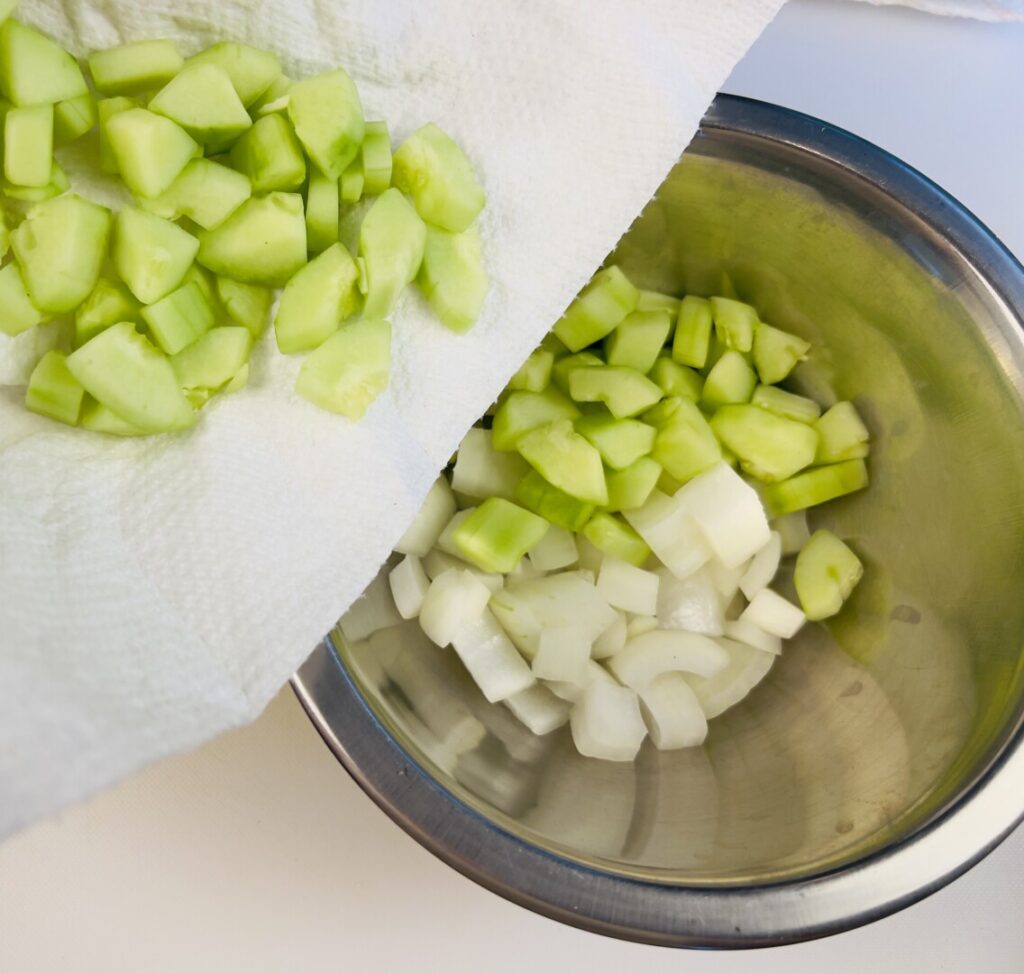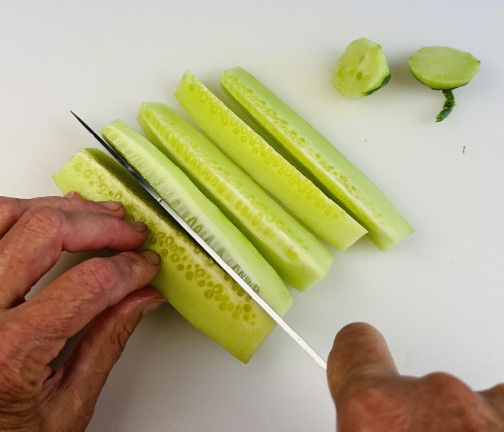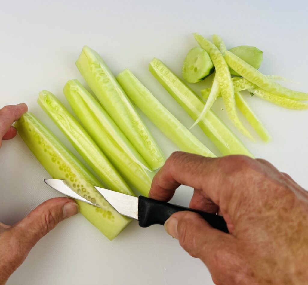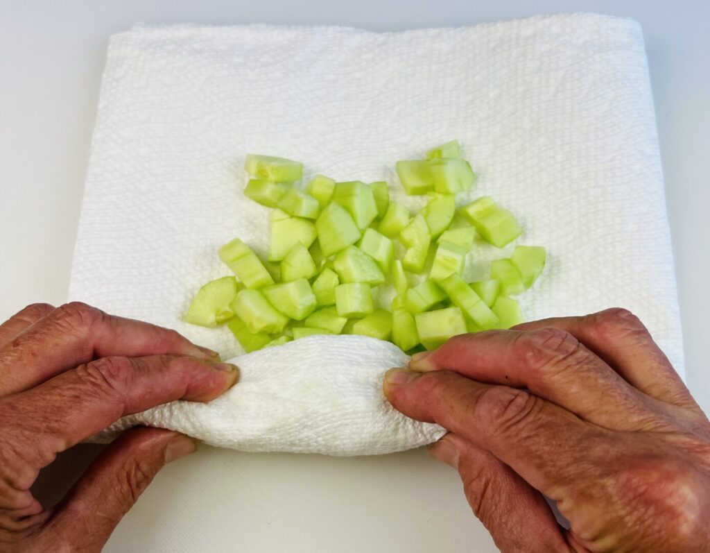 - Peel the cucumber. Cut it lengthwise into 6 long wedges, and then use a paring knife to remove the seeds. Cut the wedges into rough ½-inch dice. Place the cucumber dice onto doubled paper towels, roll up the towels, and gently squeeze the roll to remove excess liquid.