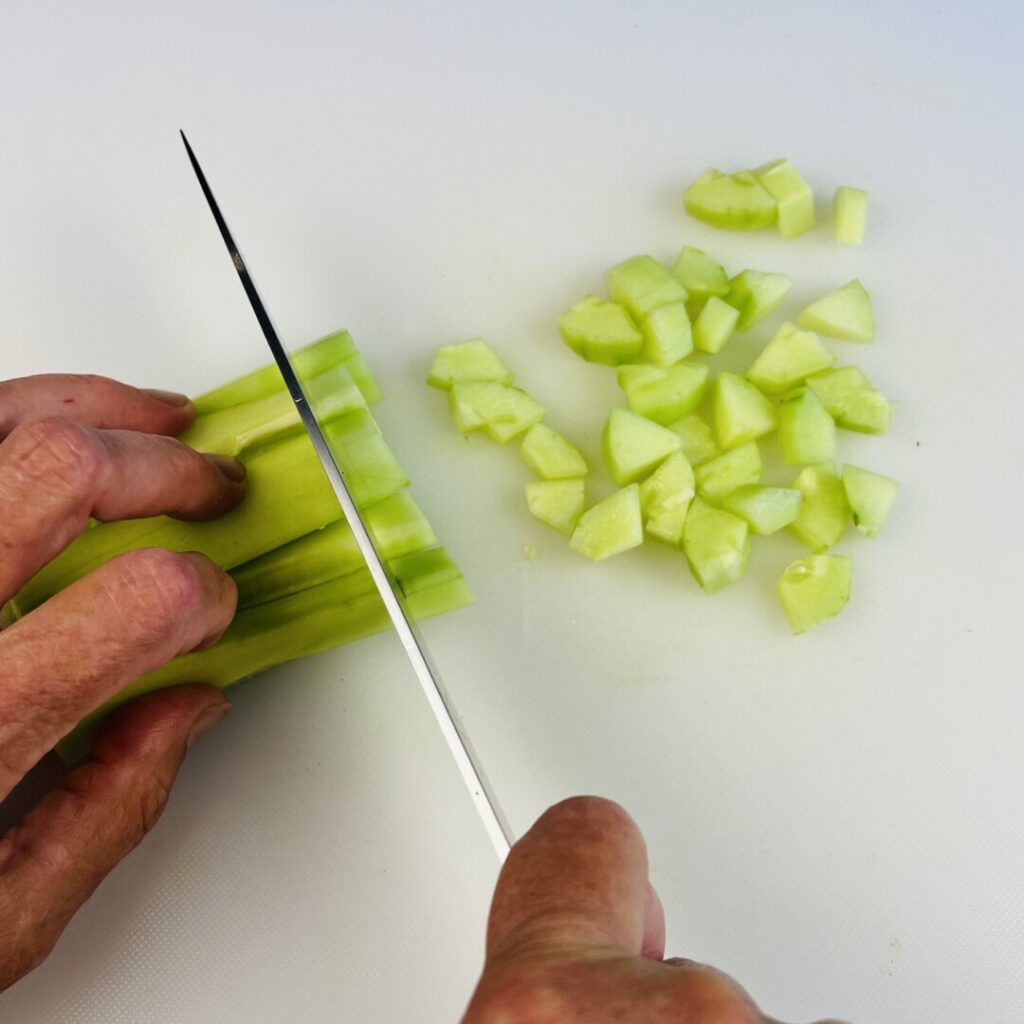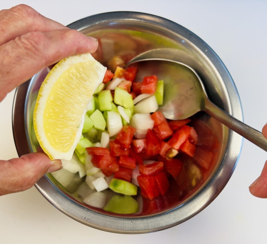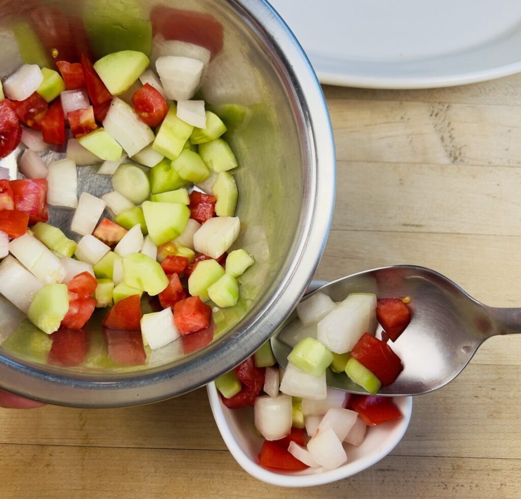 - Cut the step 10 onion into rough ½-inch dice and place in a bowl, then stir in the cucumber and tomato.