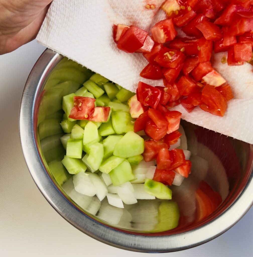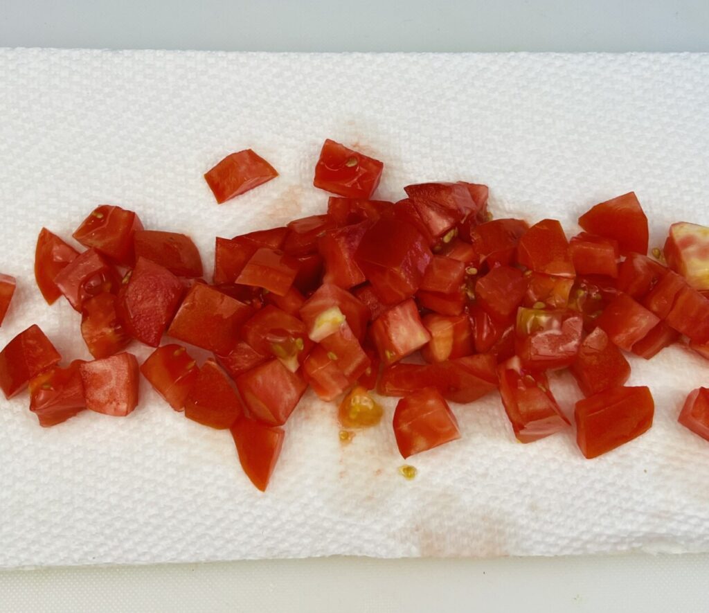 - Cut the tomato into rough ½-inch dice and spread out onto doubled paper towels to remove excess liquid.