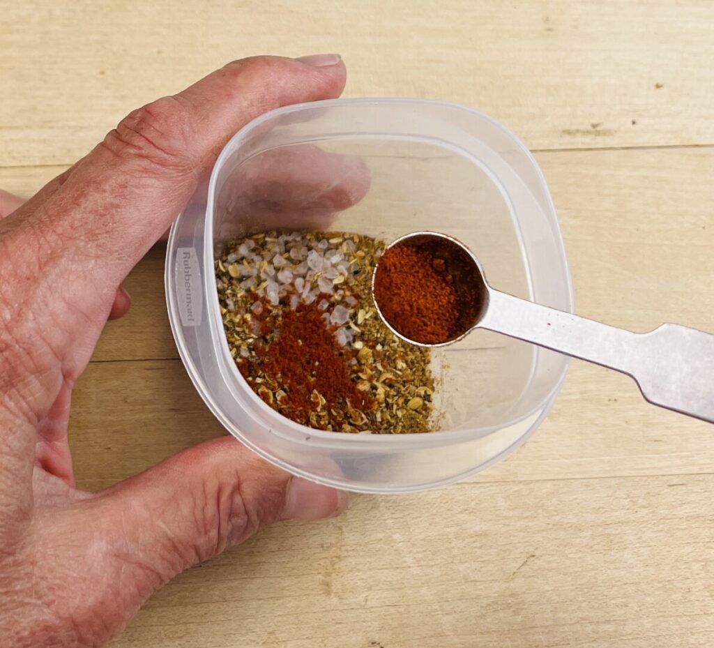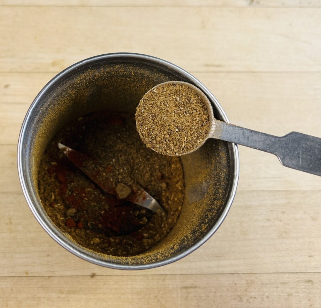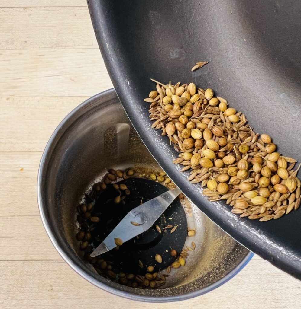 For this recipe you’ll need to toast coriander seeds and cumin seeds. Since the coriander seeds are larger, you’ll start them first. Toast them in a dry pan, shaking often, until slightly fragrant. The add the smaller cumin seeds and continue toasting until both spices are very fragrant and just beginning to darken in color. Don’t let them turn brown! Then, immediately transfer the seeds into a spice grinder and grind to a coarse powder. Alternatively, use a mortar and pestle in the traditional manner. Once the ground spices are cool, stir in the Kashmiri chile powder (or hot paprika), freshly-ground pepper, and salt. Store at room temperature in a tightly-sealed container.