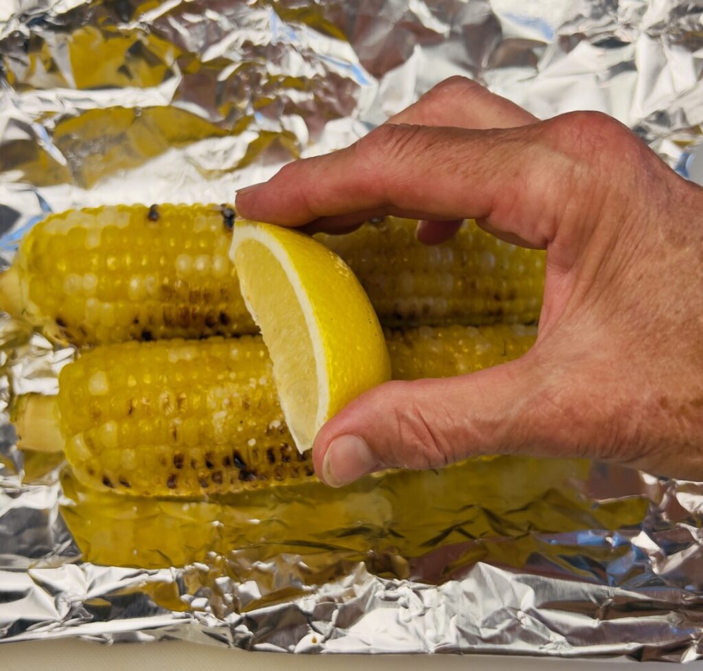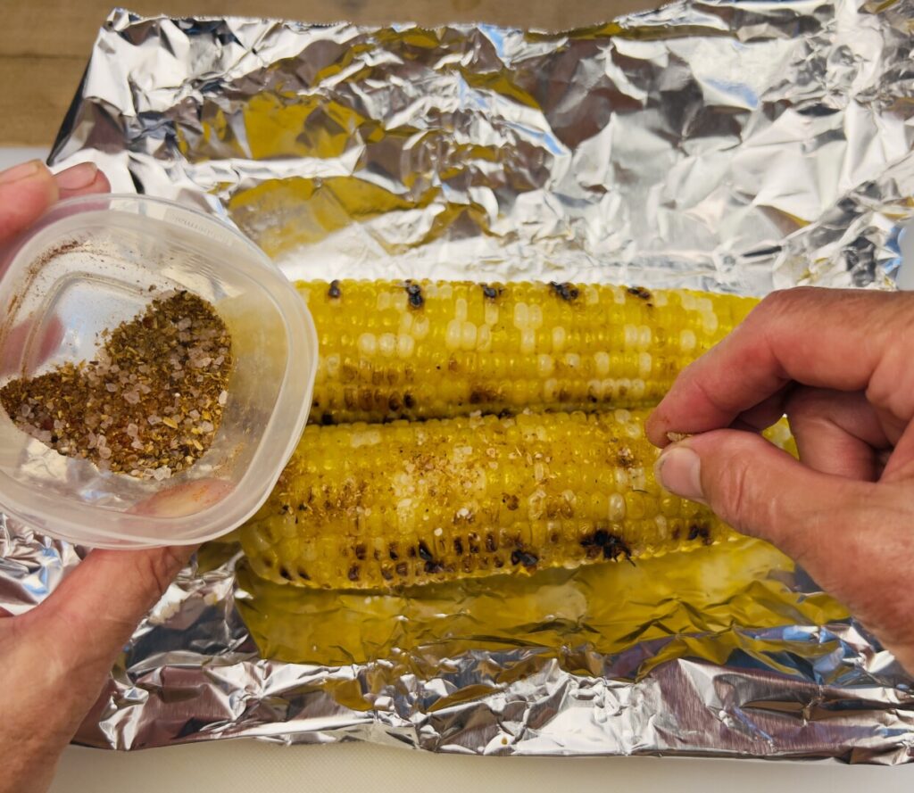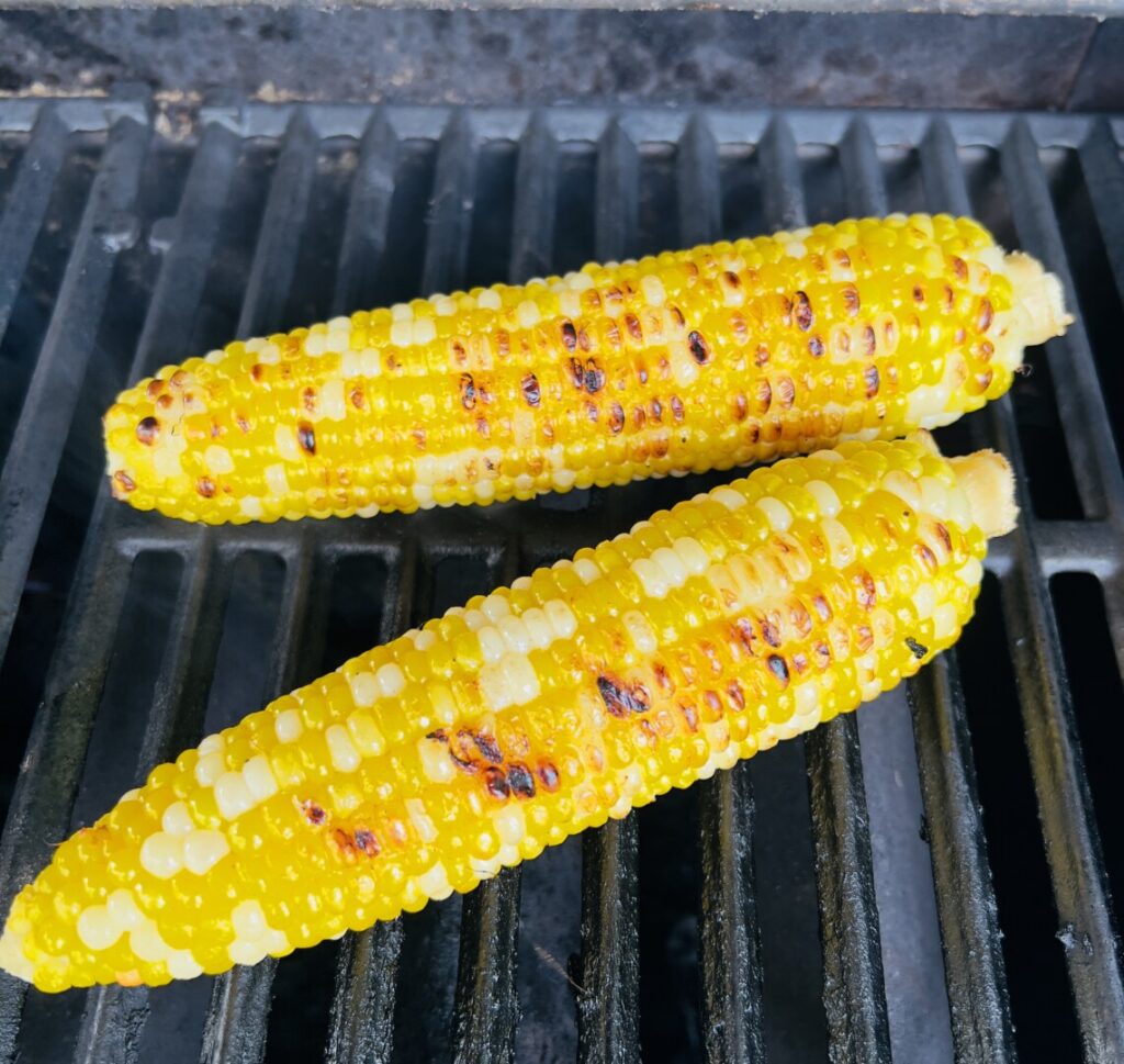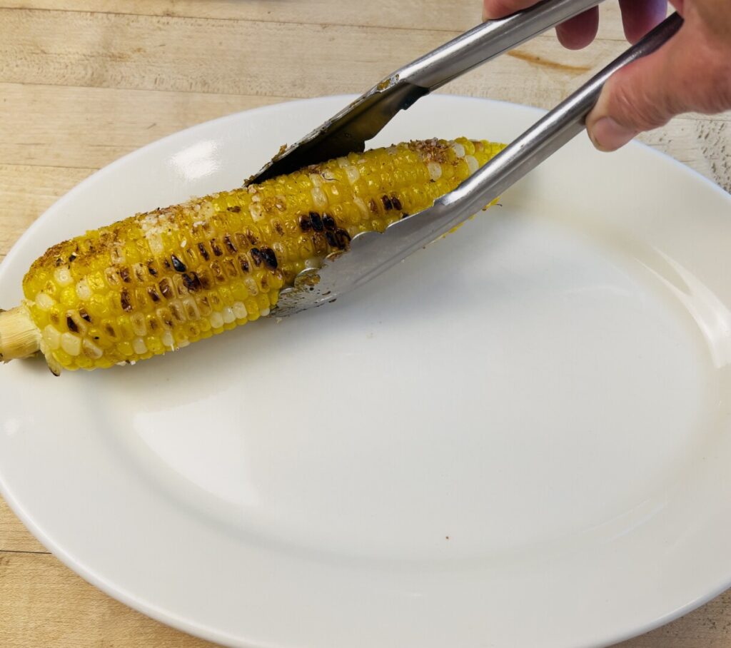 Although you can successfully cook raw corn ears start-to-finish on the grill, that requires leaving on some of the husk and pre-soaking to ensure enough steam to tenderize the kernels. That’s a great method for a leisurely weekend meal, but for a fast weekday dinner finish it’s more convenient to par-boil shucked corn ahead of time. Cook in boiling water, refresh under cold water, and then blot dry on paper towels.