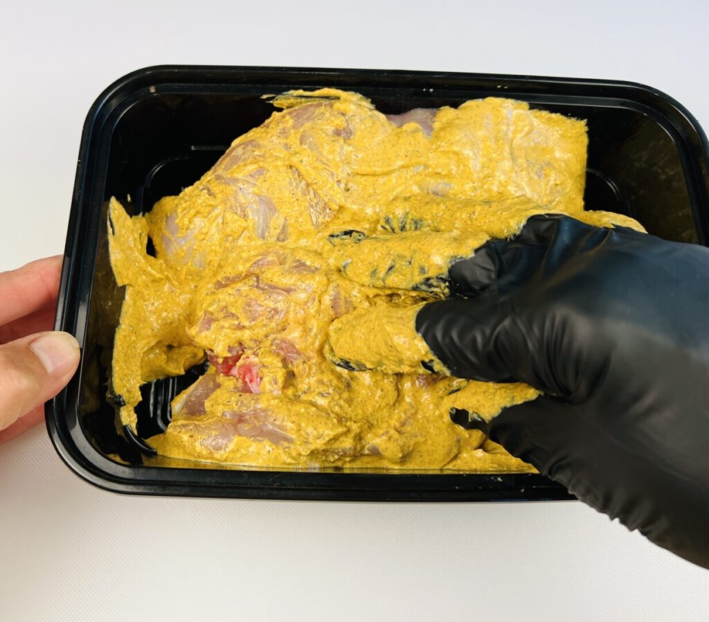 - Place the chicken legs into a container and then scrape the tandoori marinade over it. Massage the marinade into the chicken flesh.